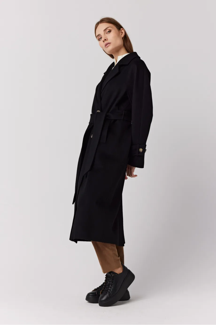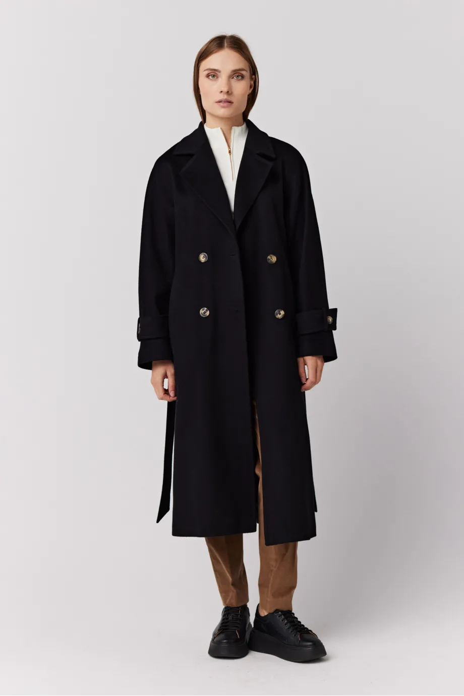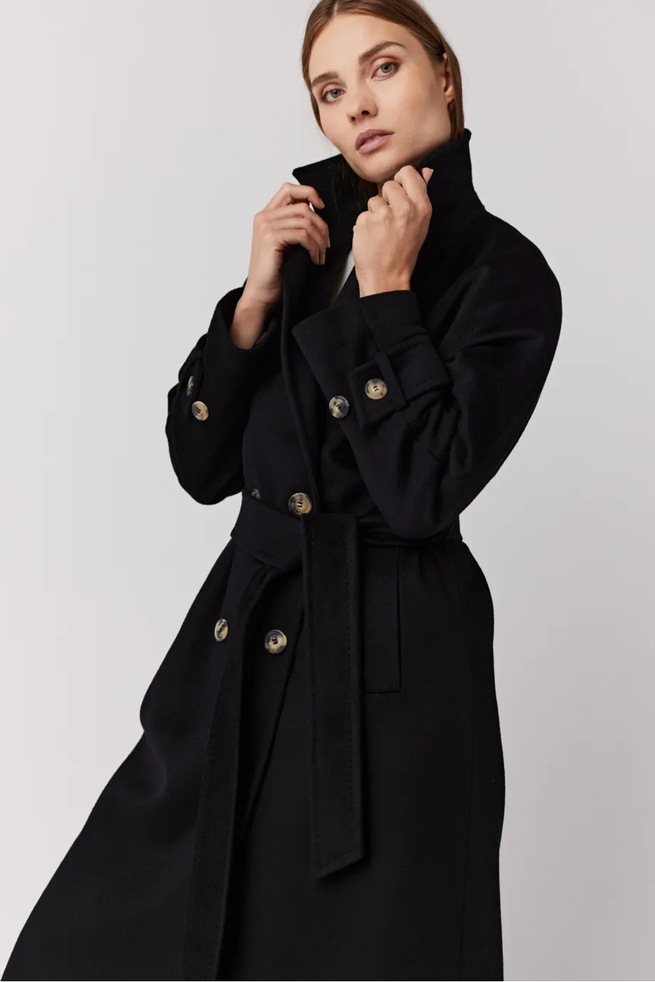 Der Mantel verfügt über dekorative Steppnähte und Knöpfe aus Büffelhorn
