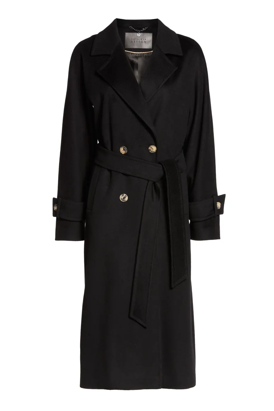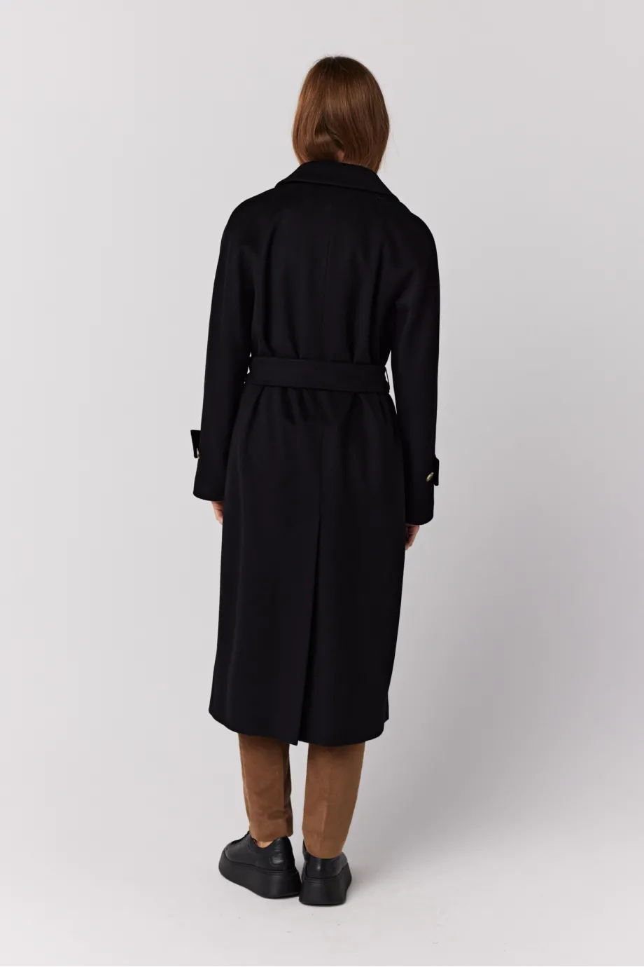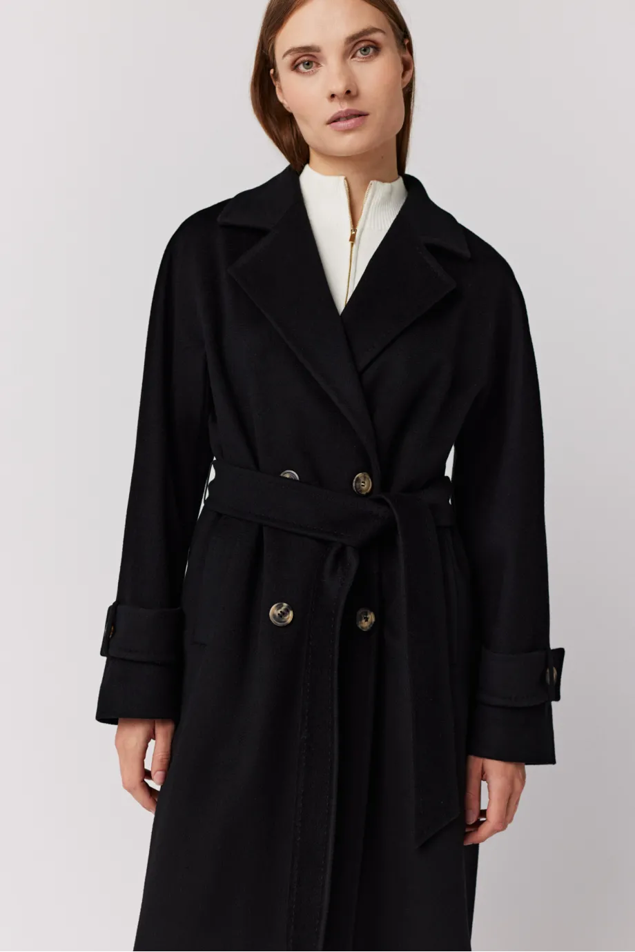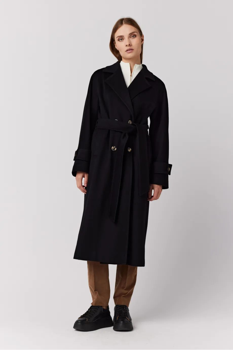 Der Mantel verfügt über dekorative Steppnähte und Knöpfe aus Büffelhorn