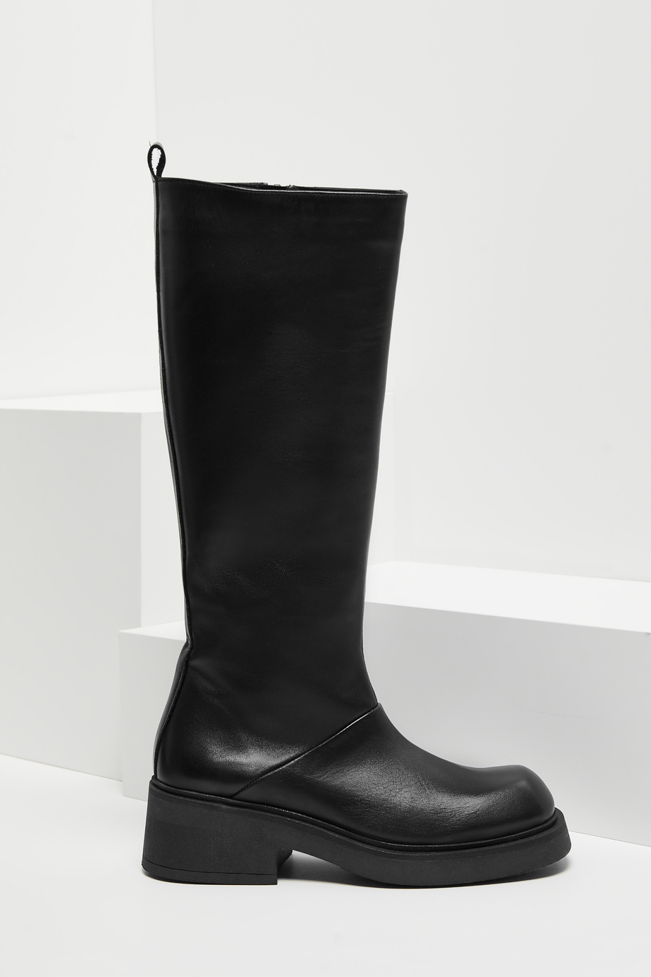 Robuste Sohle und hoher Schaft aus glattem, perfekt schwarzem Naturleder.