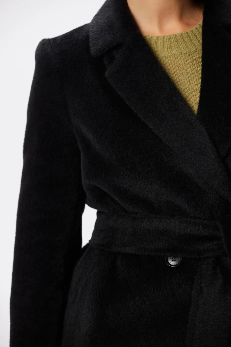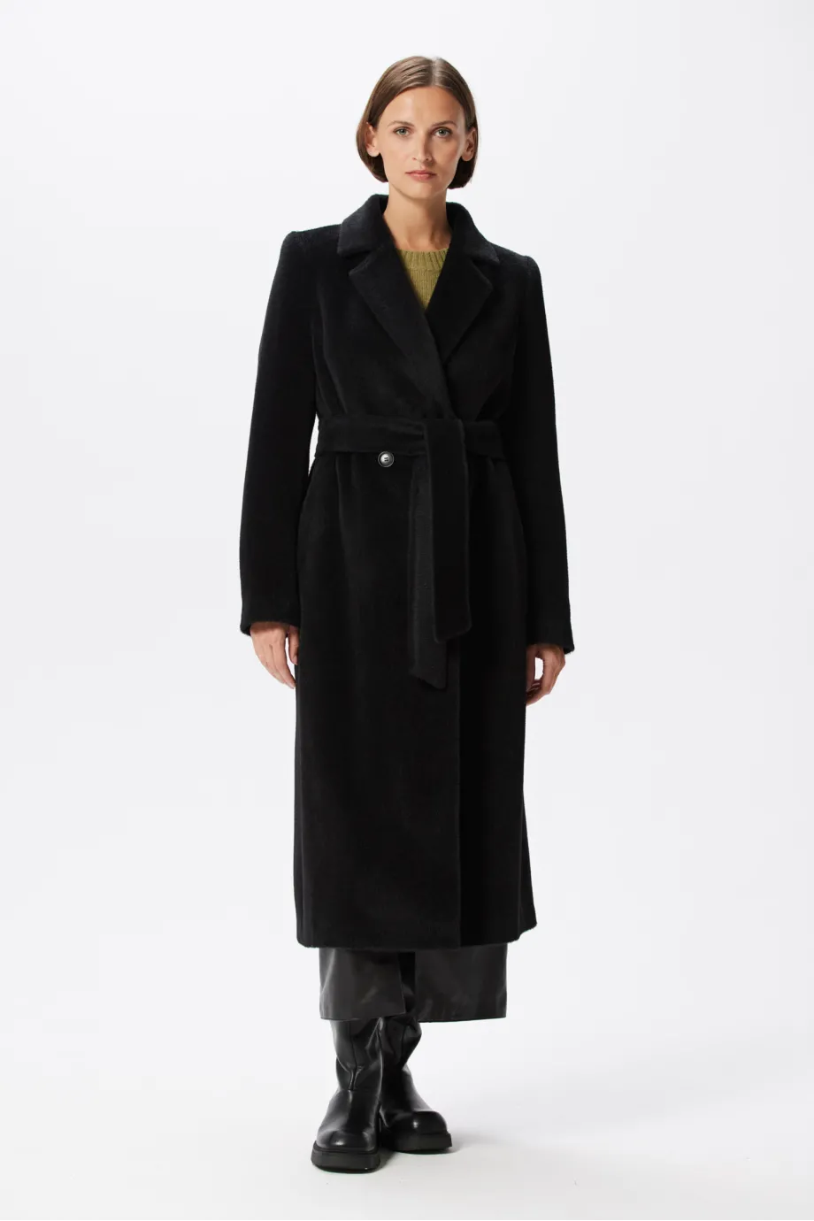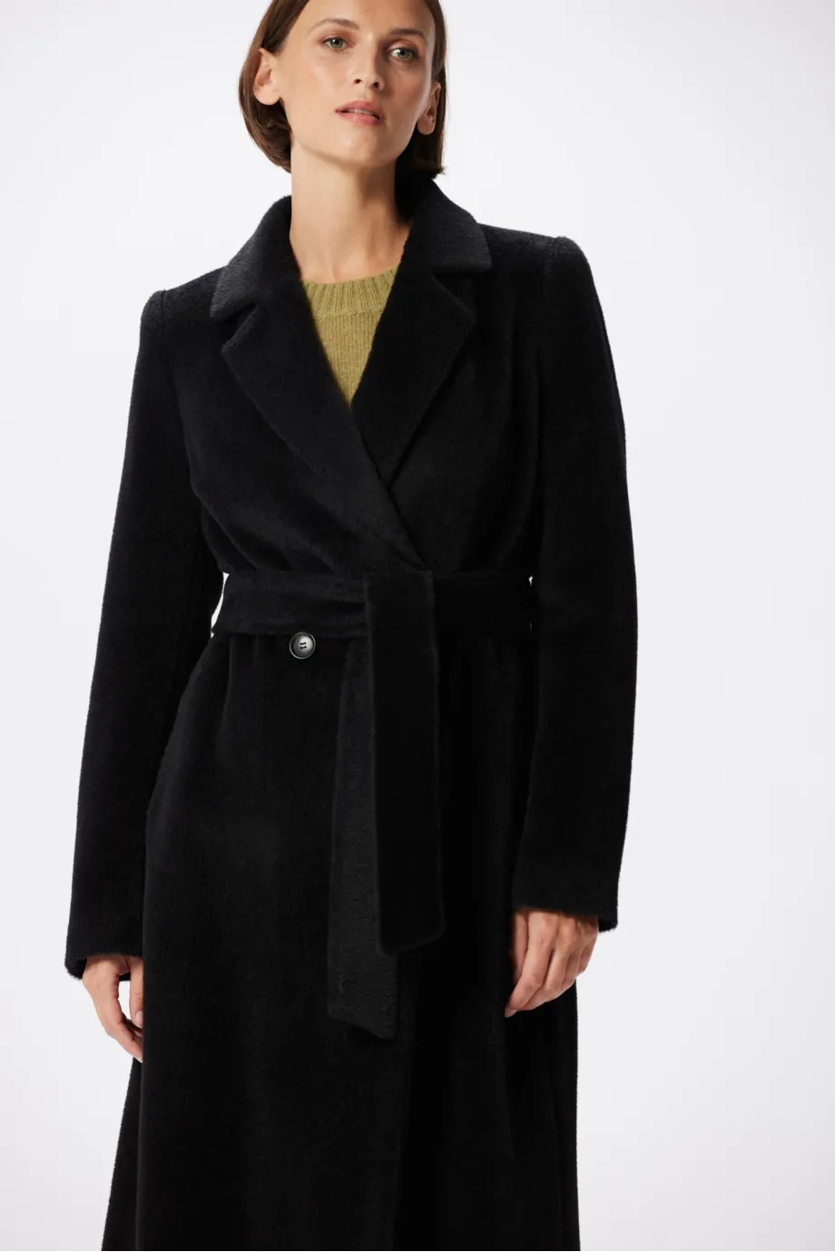 Schwarzer Mantel mit Gürtel aus Suri-Alpaka