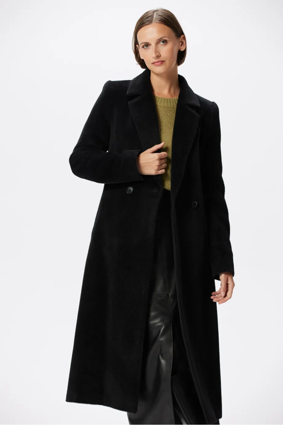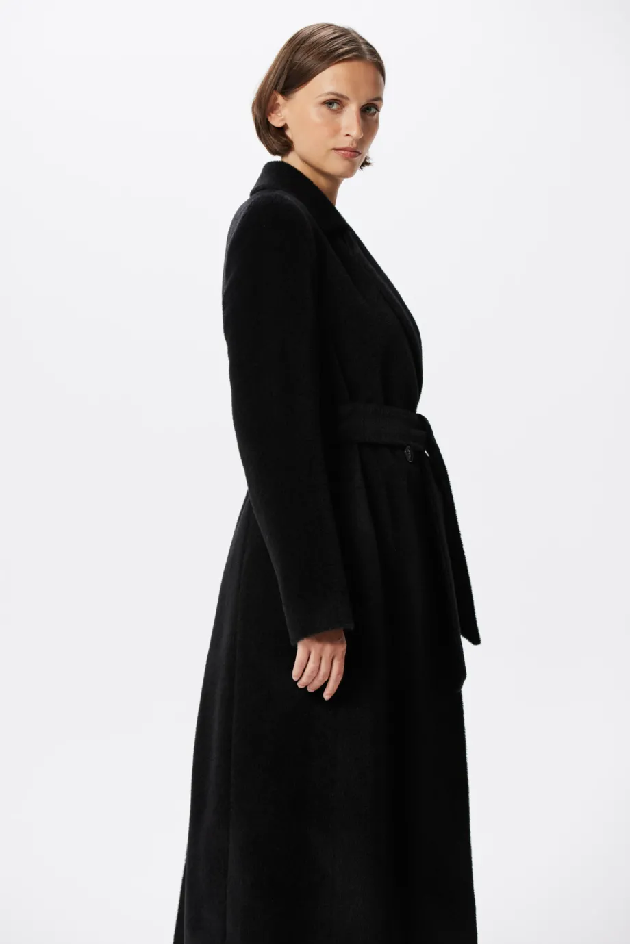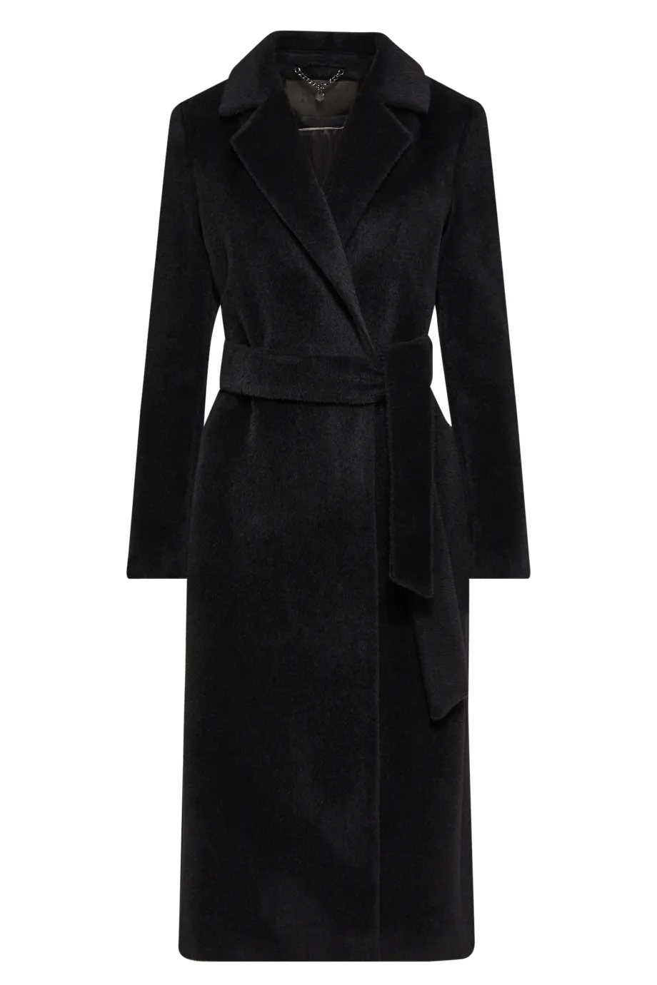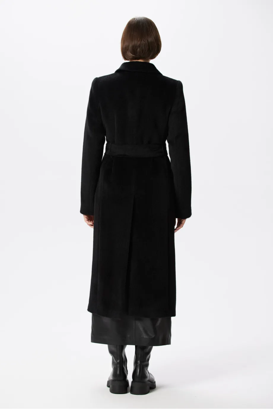 Schwarzer Mantel mit Gürtel aus Suri-Alpaka