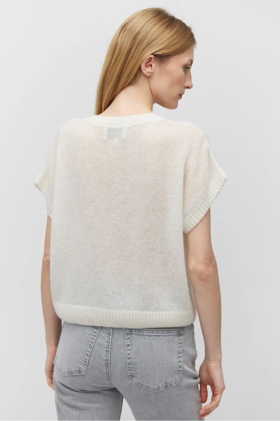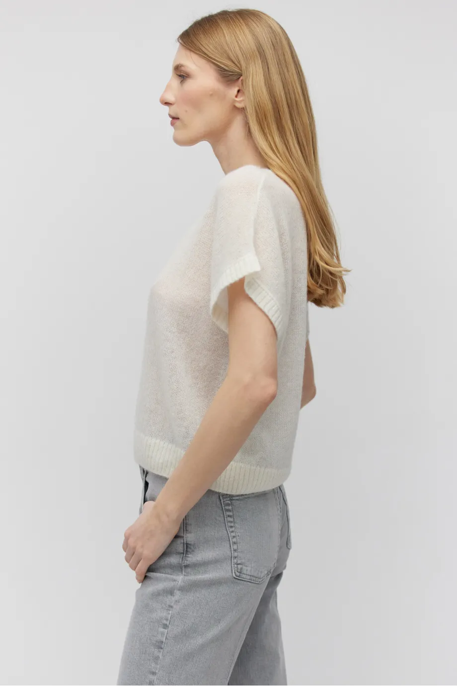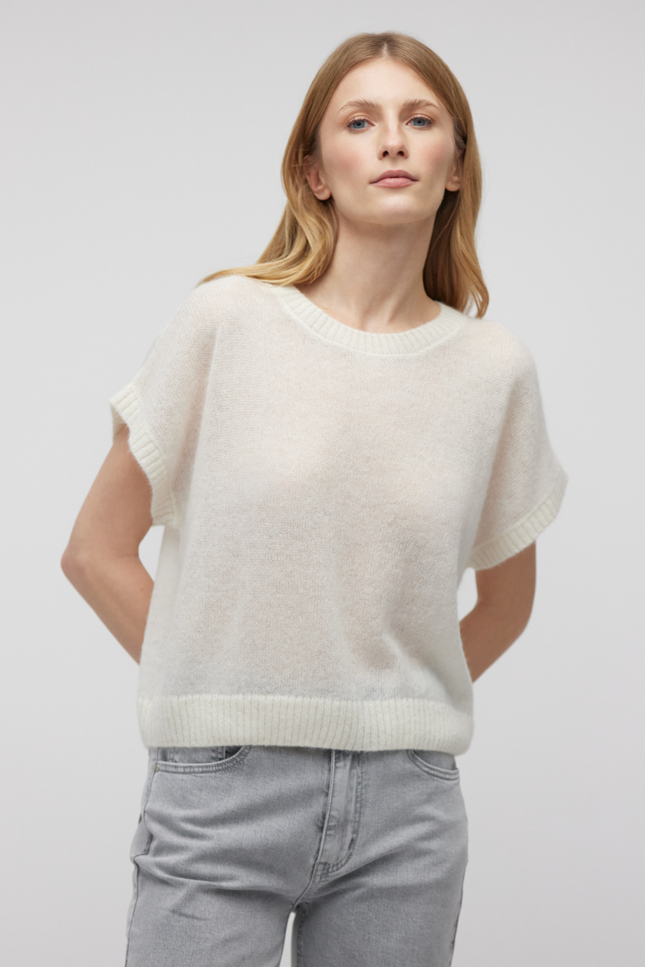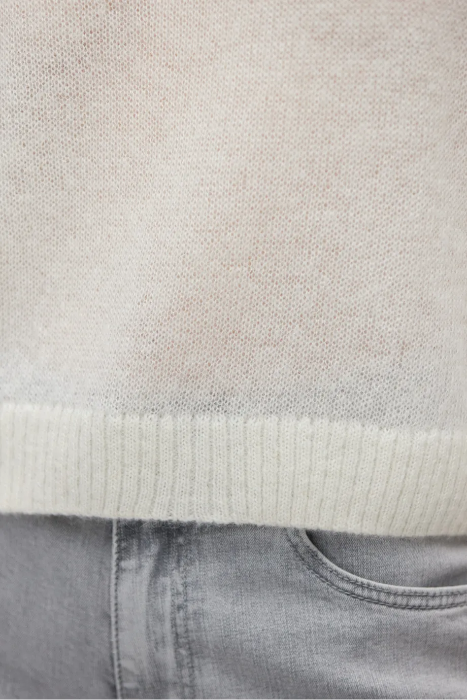 Weiches Gestrick mit Baby-Alpakawolle, lockerer Jersey-Stich kombiniert mit 2x2 Ripp, hergestellt auf einer Maschine mit 5 GG Maschenweite.