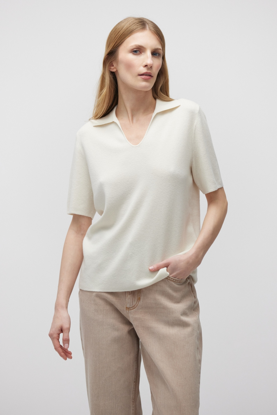 V-Ausschnitt mit Polokragen, kurze Ärmel.