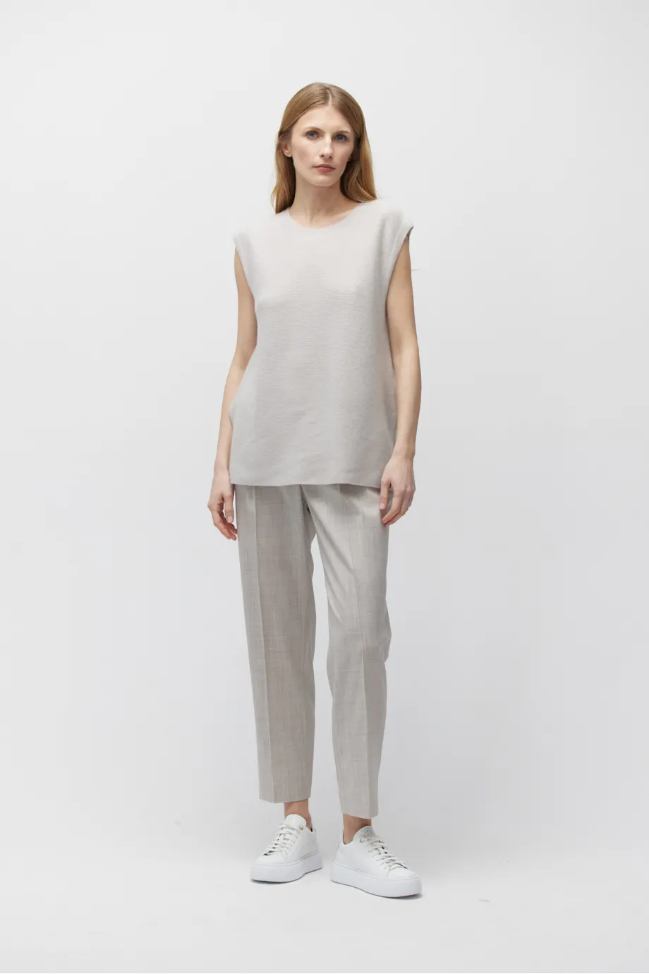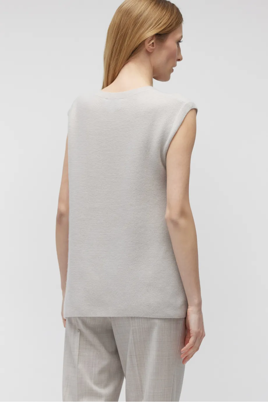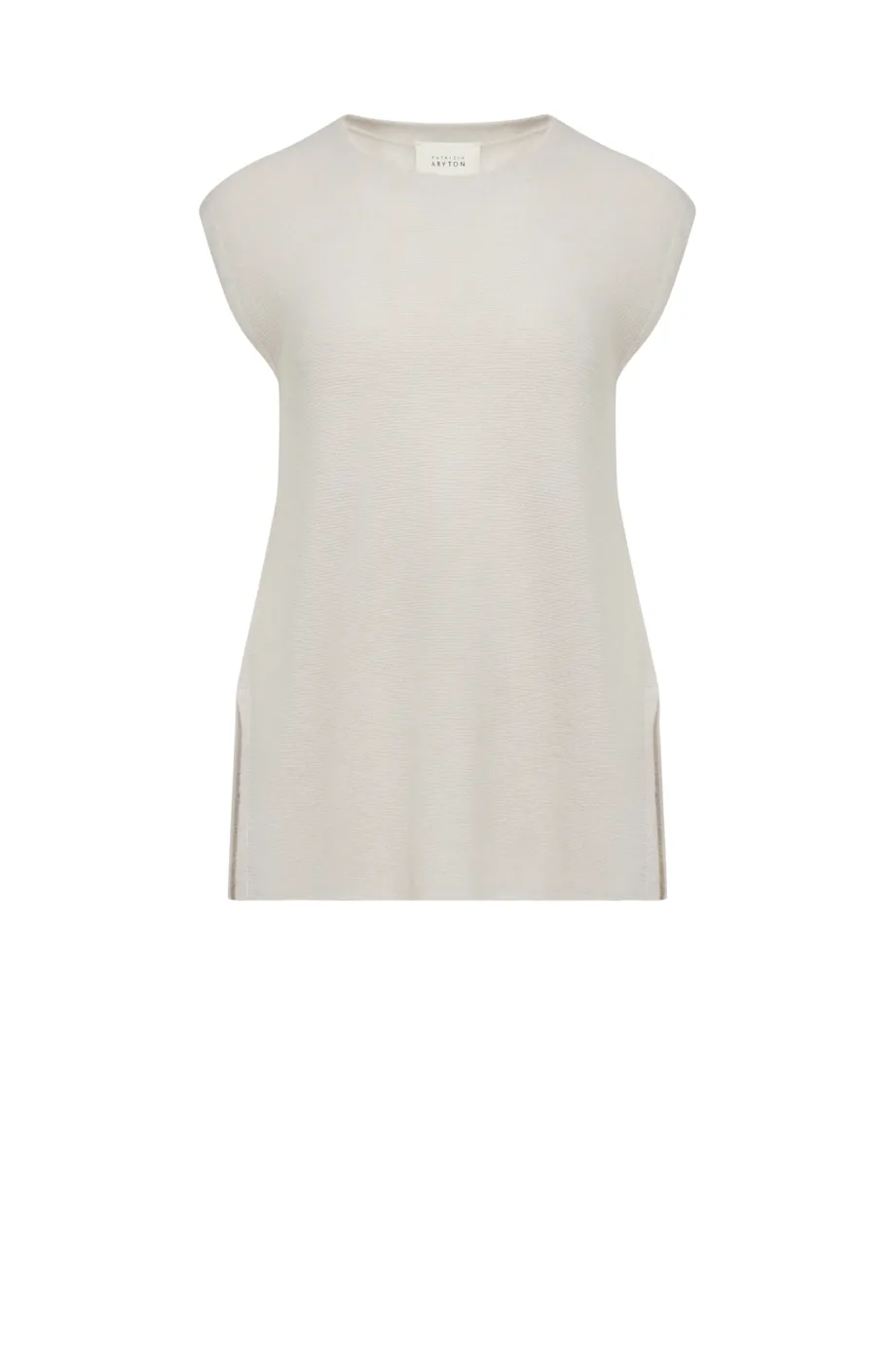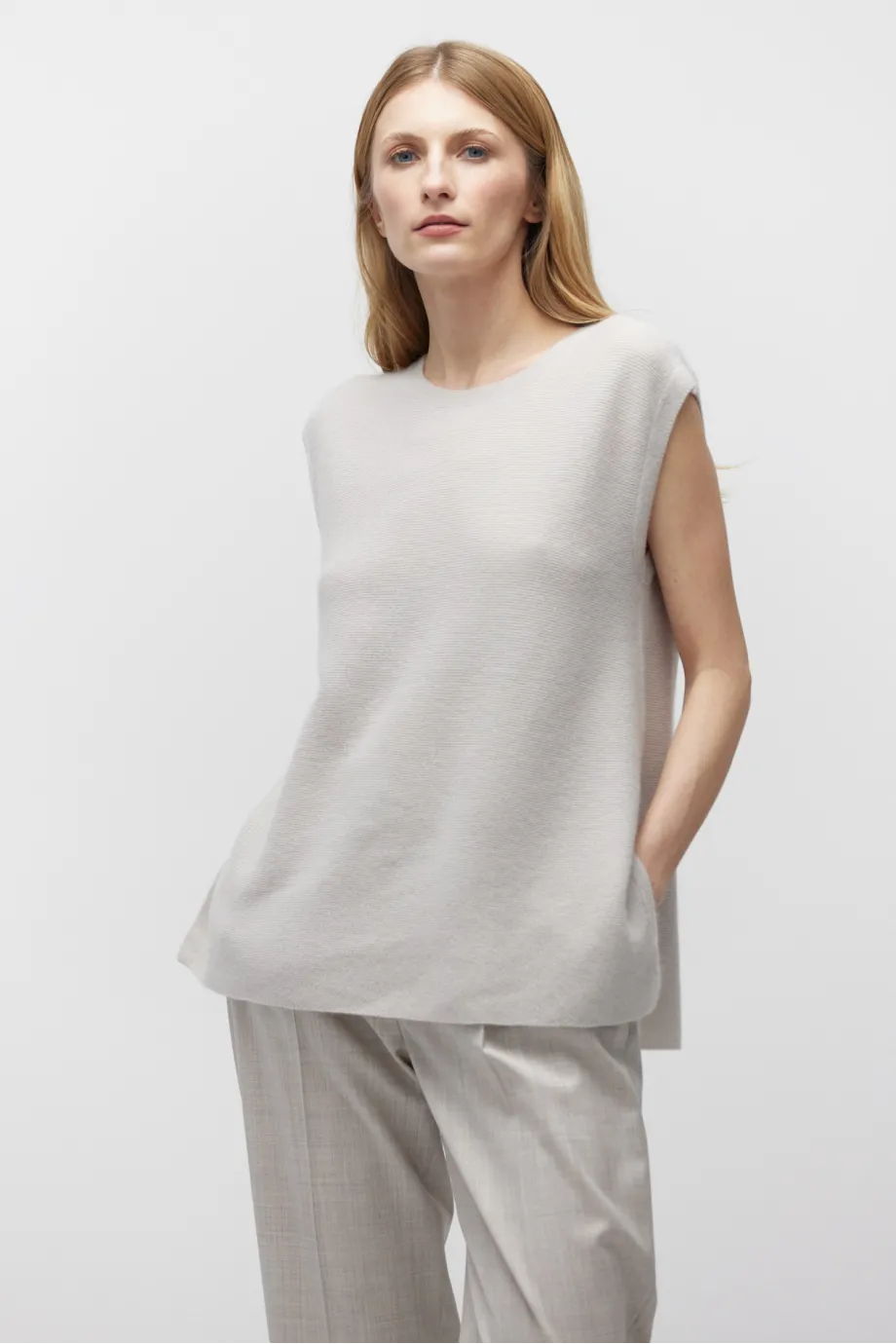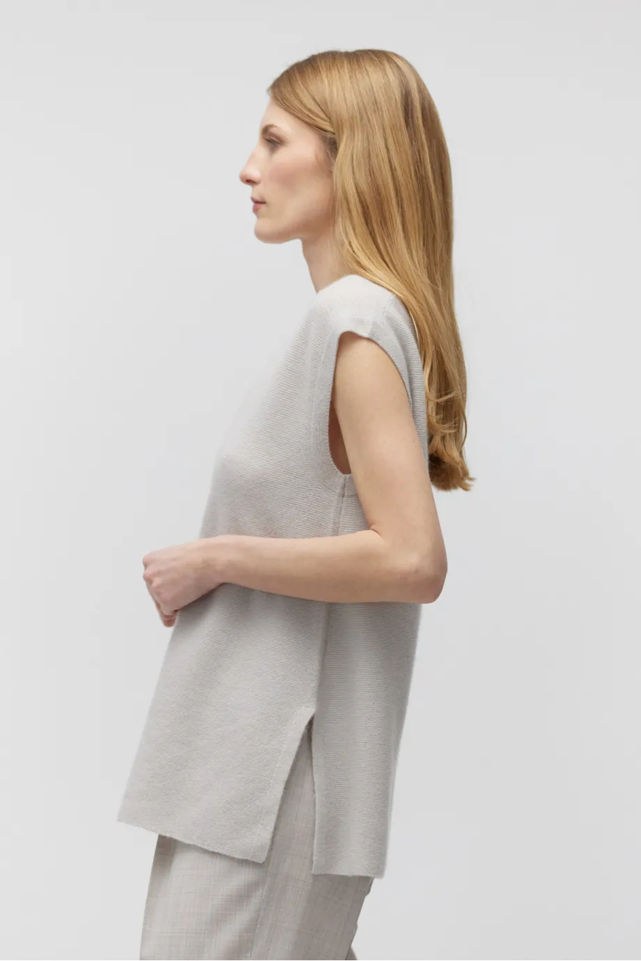 Schlichte Form, ärmellos, runder Ausschnitt, seitliche Schlitze für Leichtigkeit und Bewegungsfreiheit.