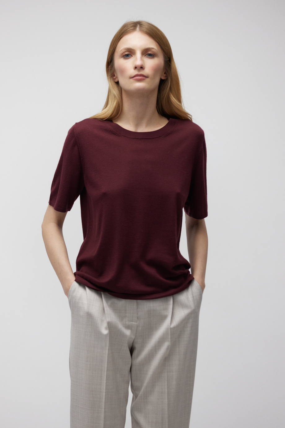 Gerader Schnitt, Rundhalsausschnitt, kurze Ärmel.