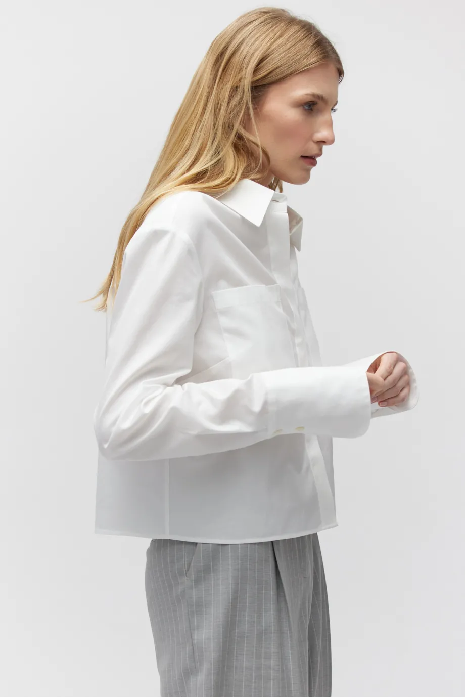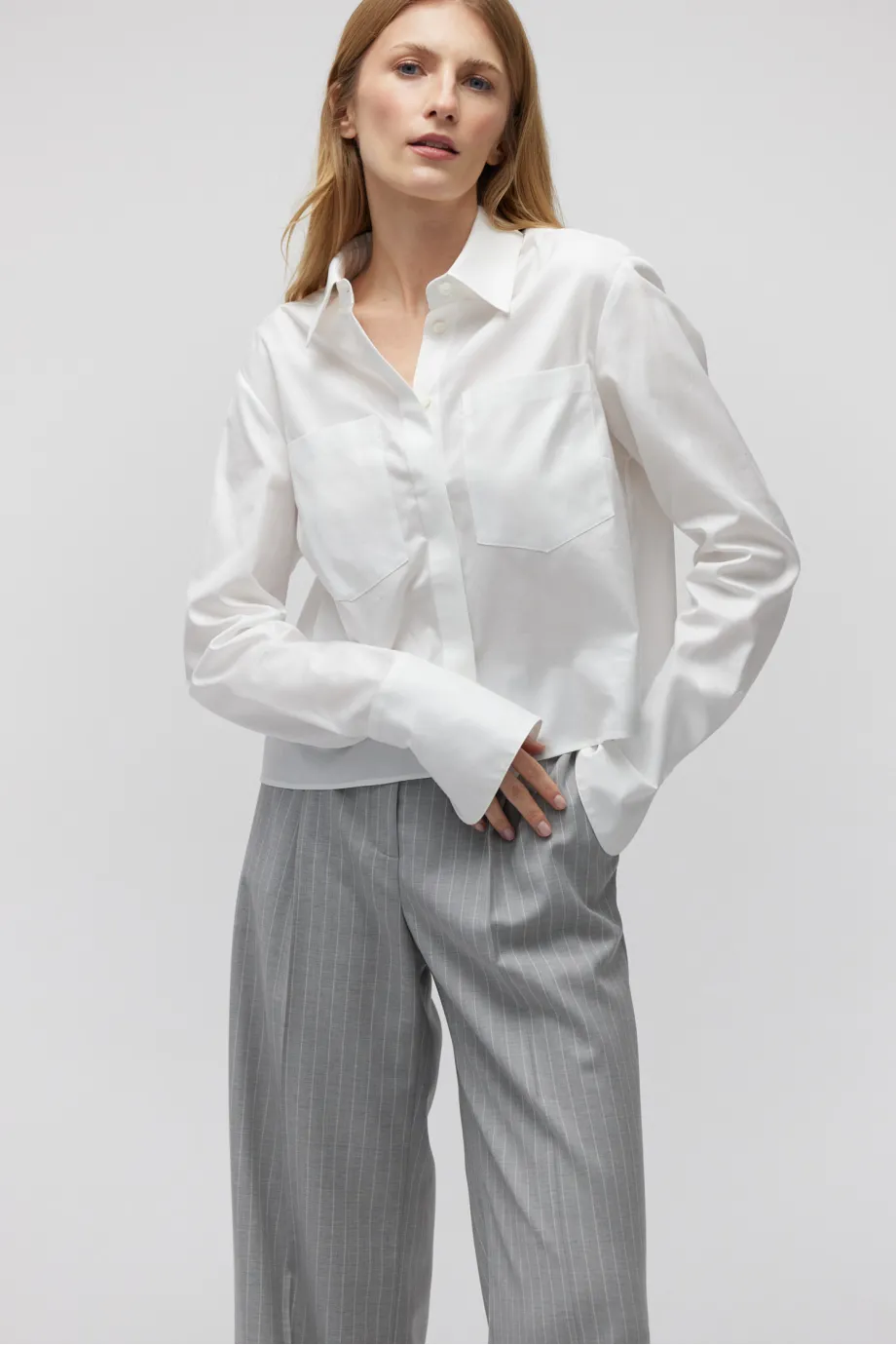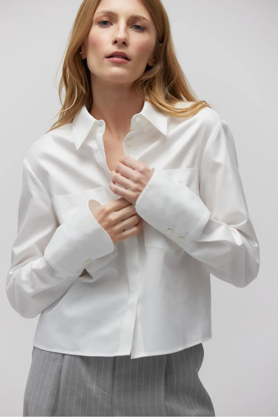 Langer Ärmel mit dekorativ umgeschlagenem Manschettenbund, Kragen, Taschen und Perlmuttknöpfen.