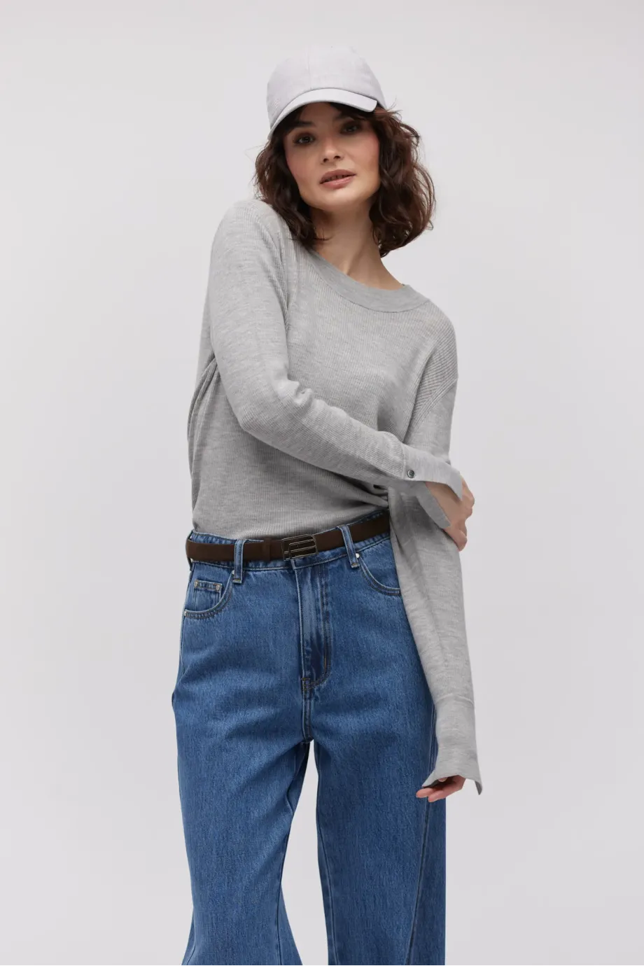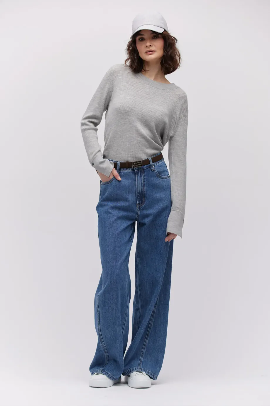 Runder Ausschnitt, Manschetten mit Perlmuttknöpfen.