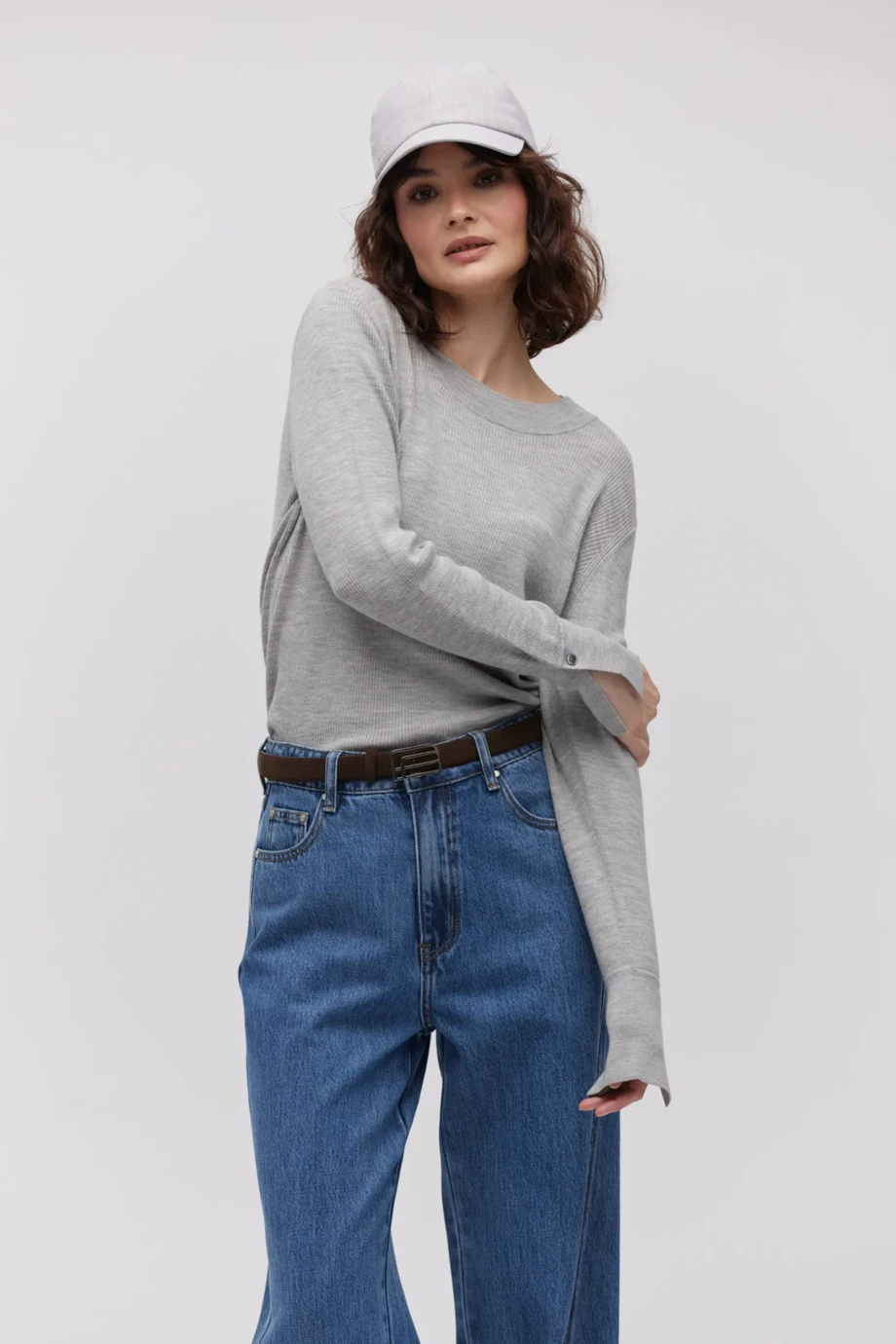 Graues Oberteil aus Merinowolle mit Rippstrick, hergestellt an einer 16 GG Maschine.
