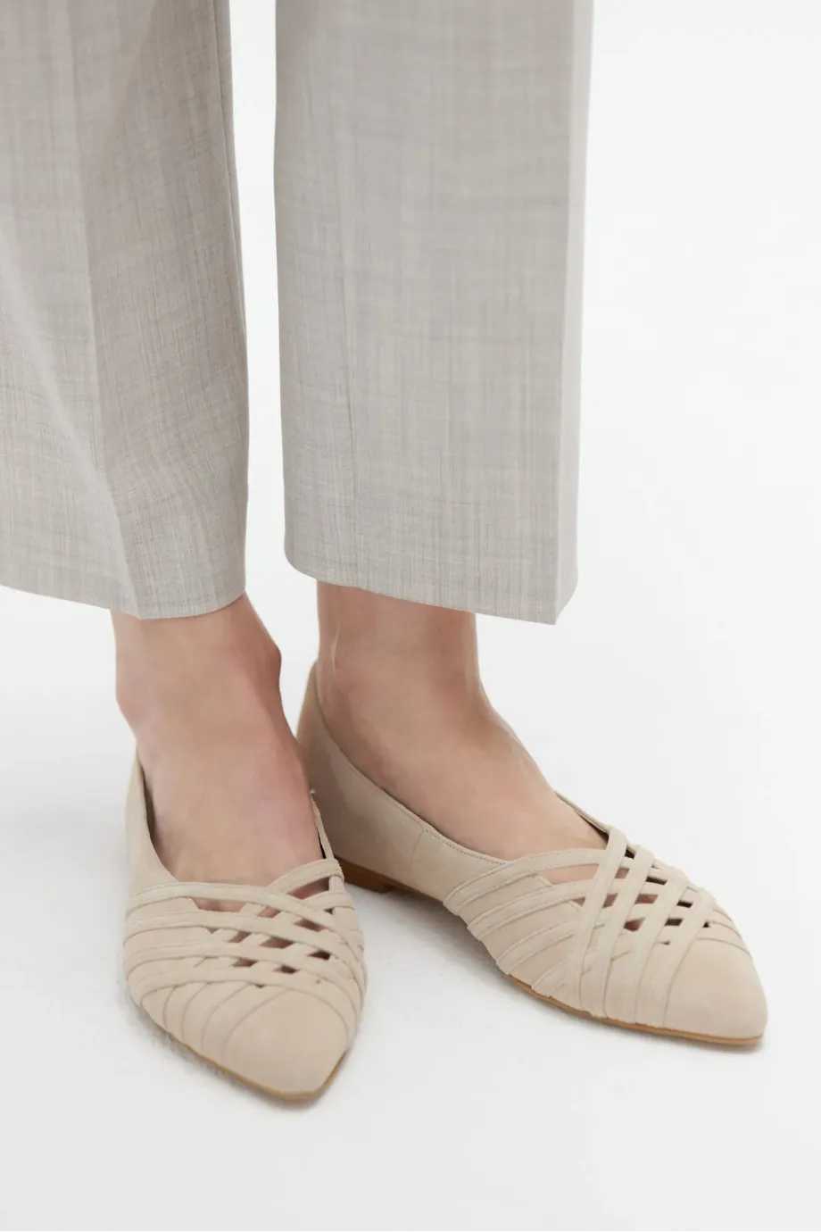 Spitz zulaufende Schuhspitze, flacher Absatz.
