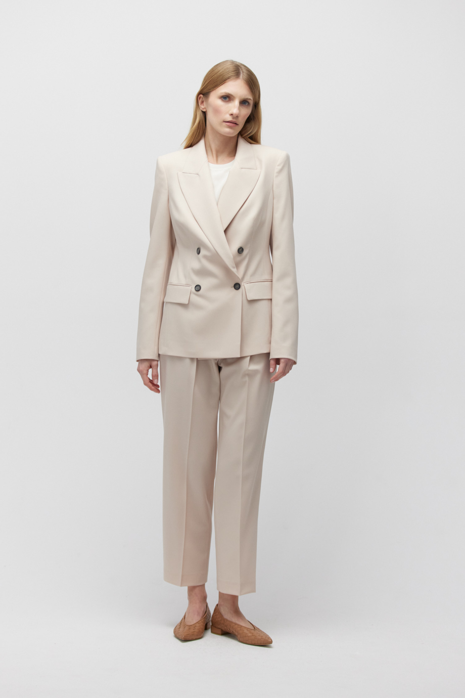 Wollhose in Nude-Farbe mit Biesen, Taschen, abgesteppten Nähten und Gürtelschlaufen.