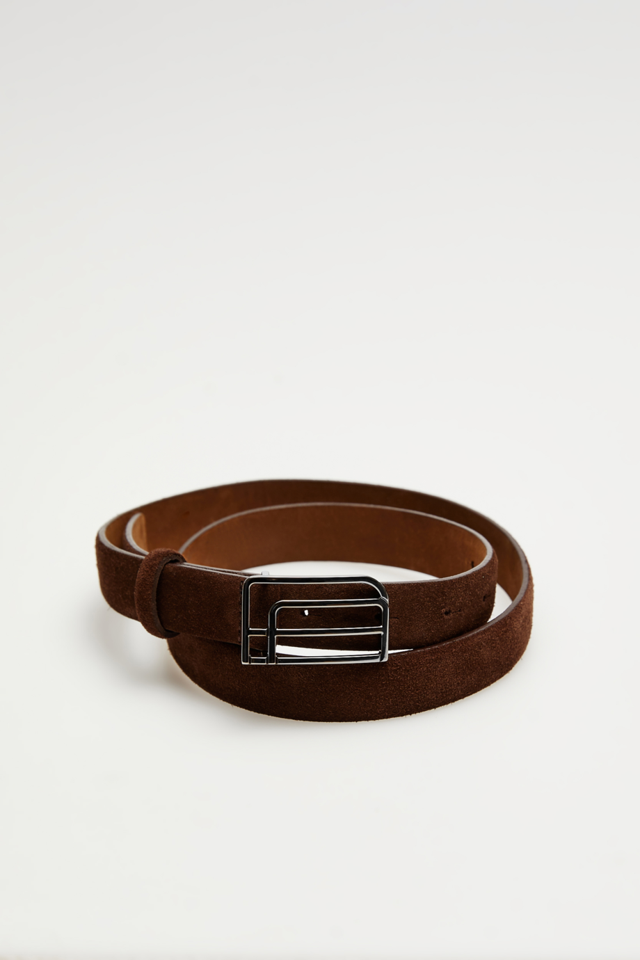 Dünner Gürtel aus braunem Wildleder, verziert mit einer länglichen Schnalle mit dem Patrizia Aryton Logo in kühlem Farbton.