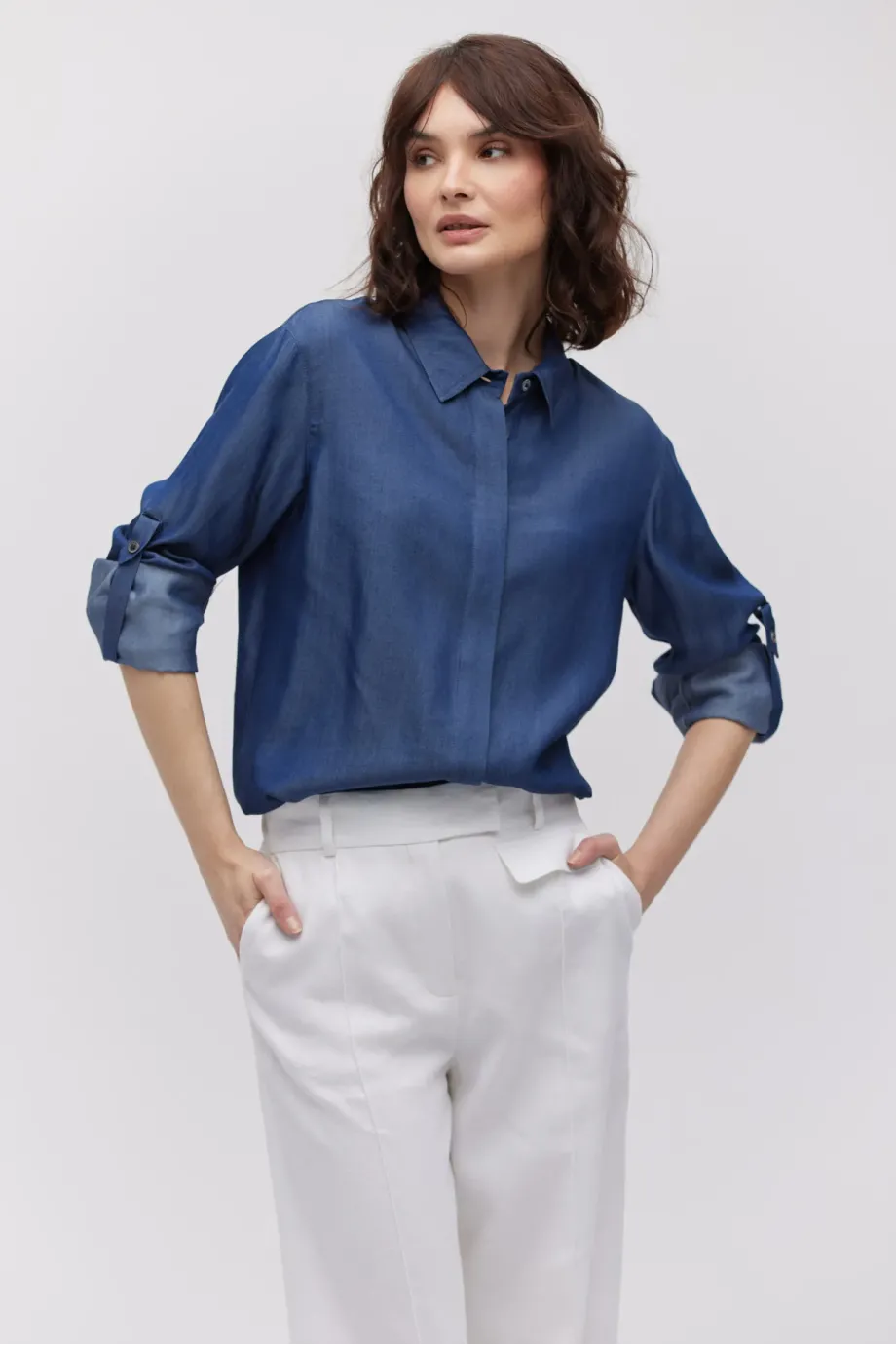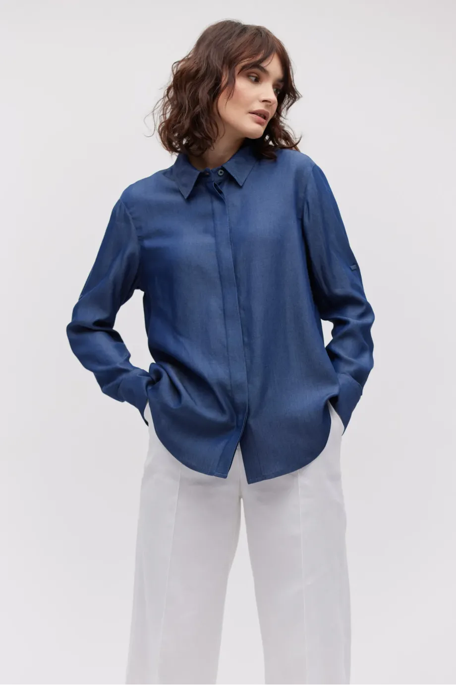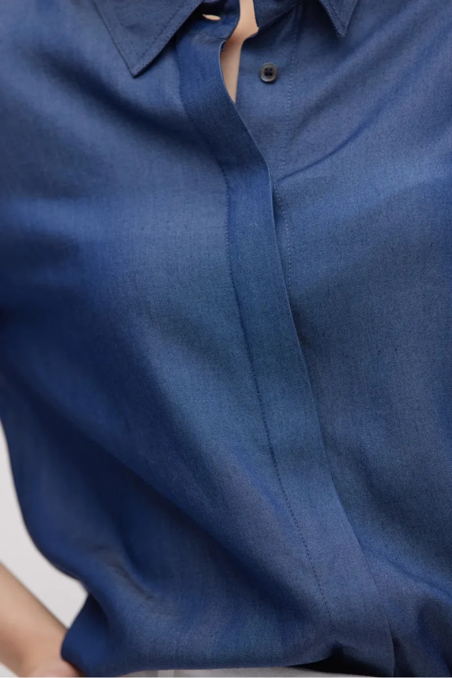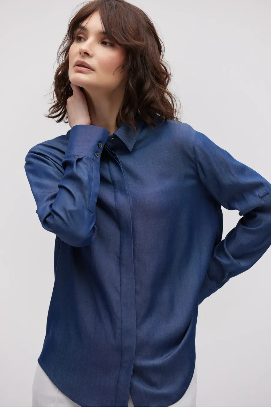 Klassischer Kragen, gerade Form und verdeckter Knopfverschluss.
