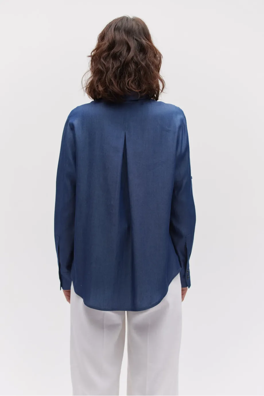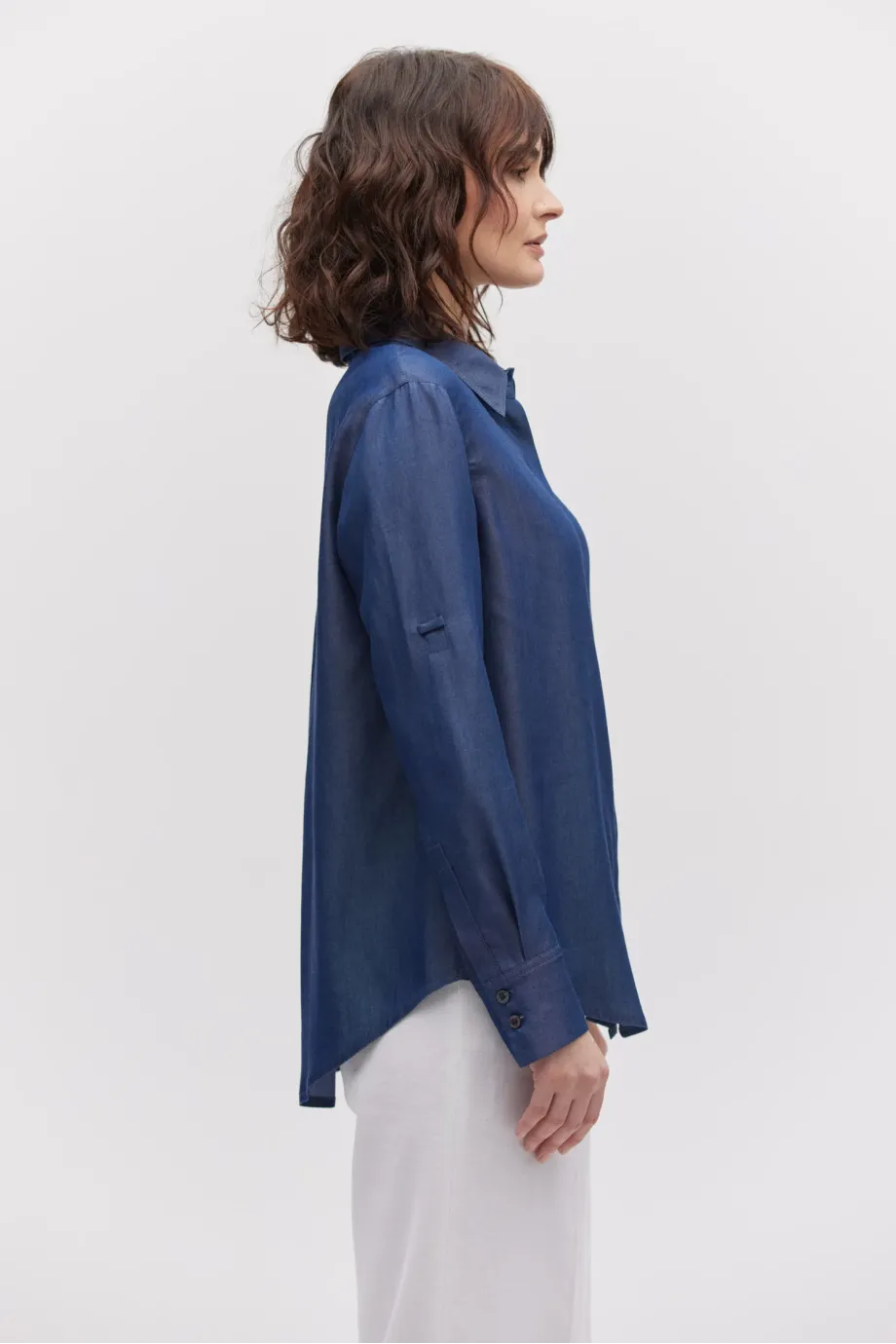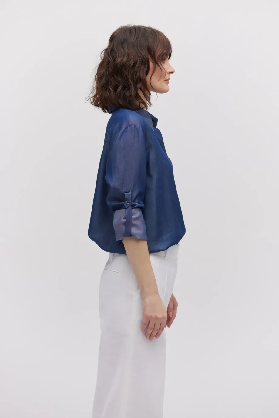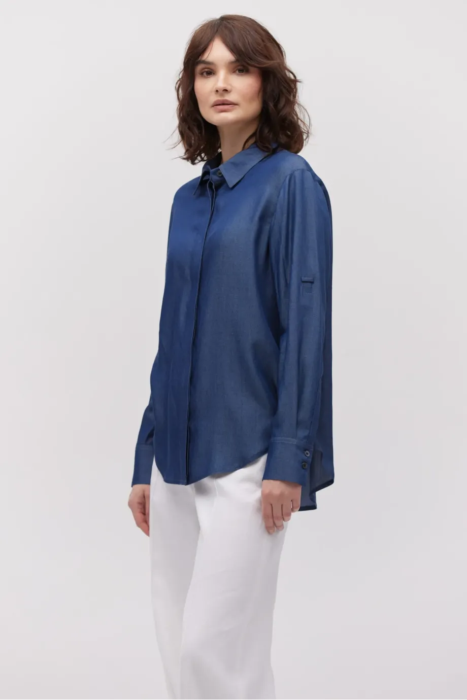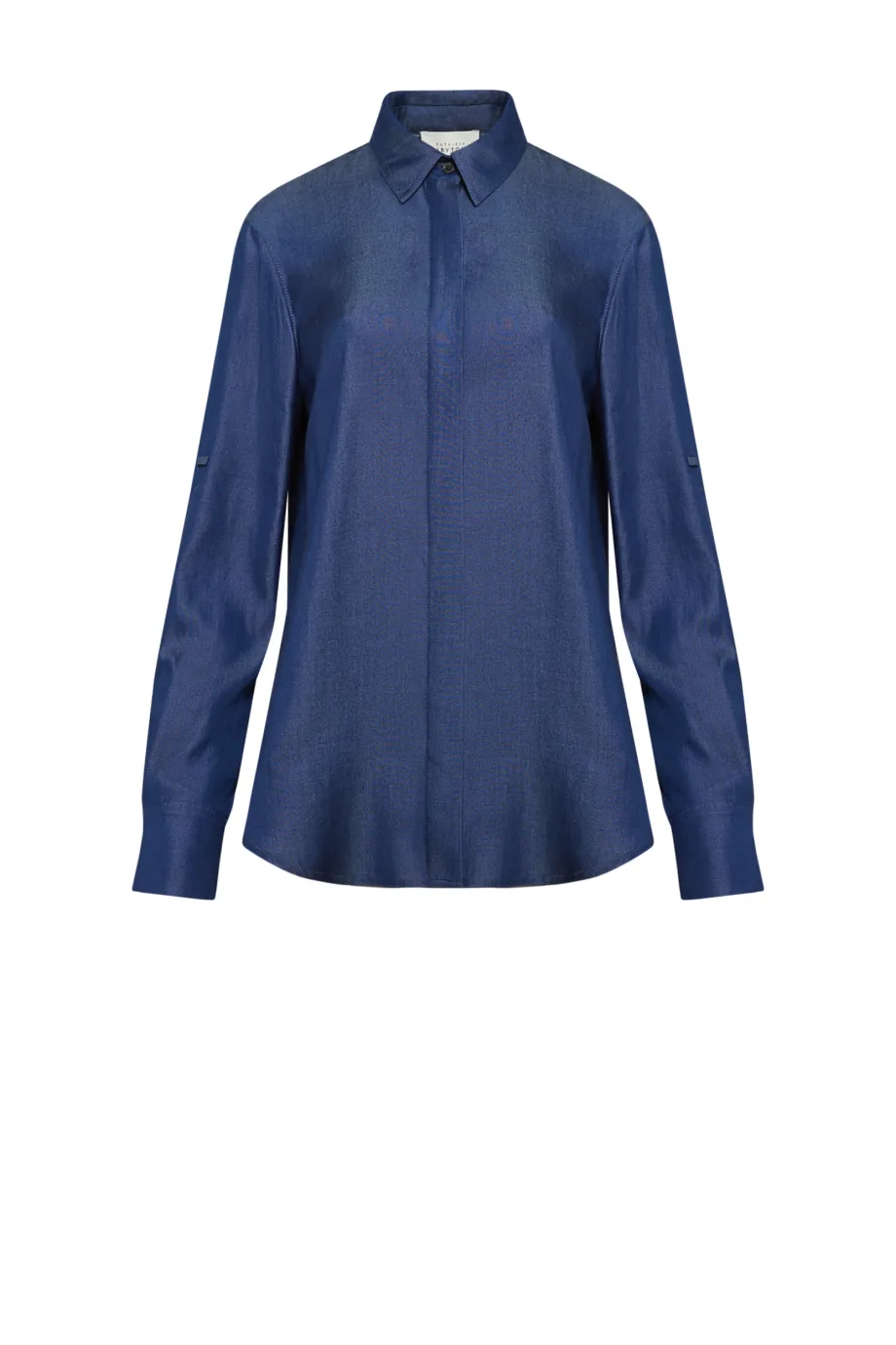 Klassischer Kragen, gerade Form und verdeckter Knopfverschluss.