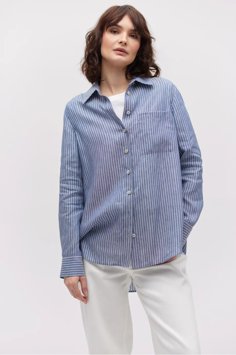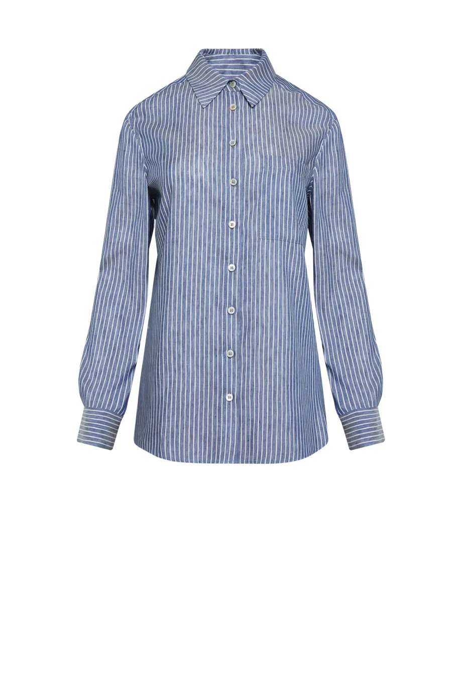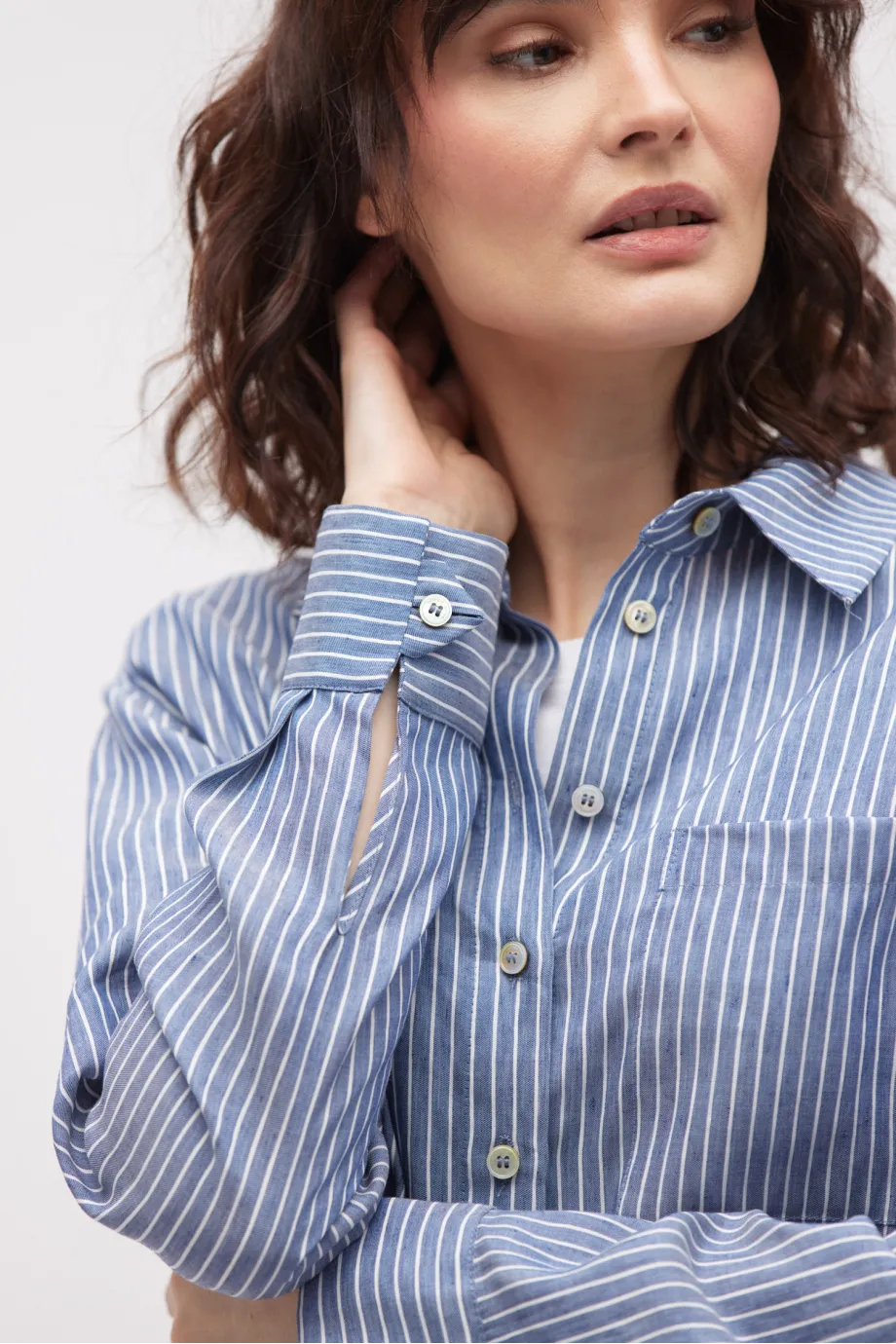Klassischer Kragen, lange Ärmel und Verschluss mit Perlmuttknöpfen.