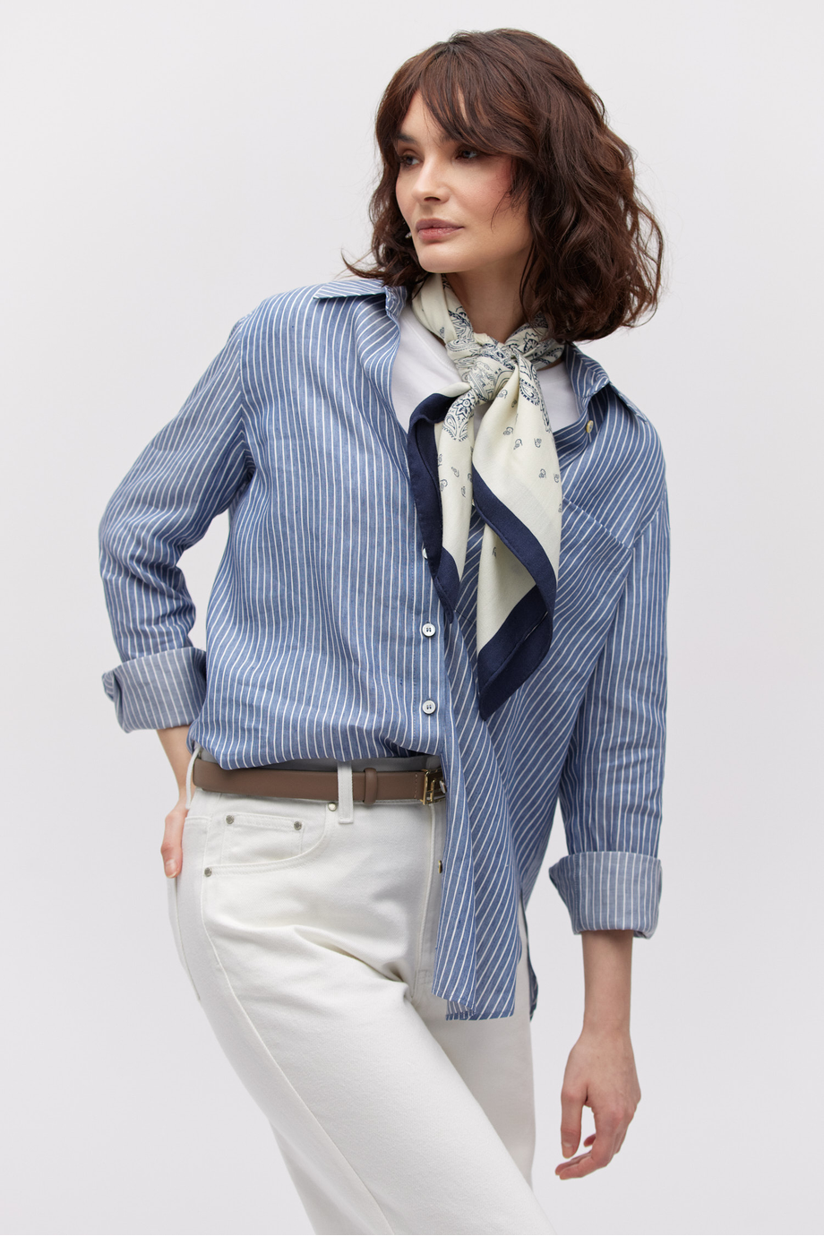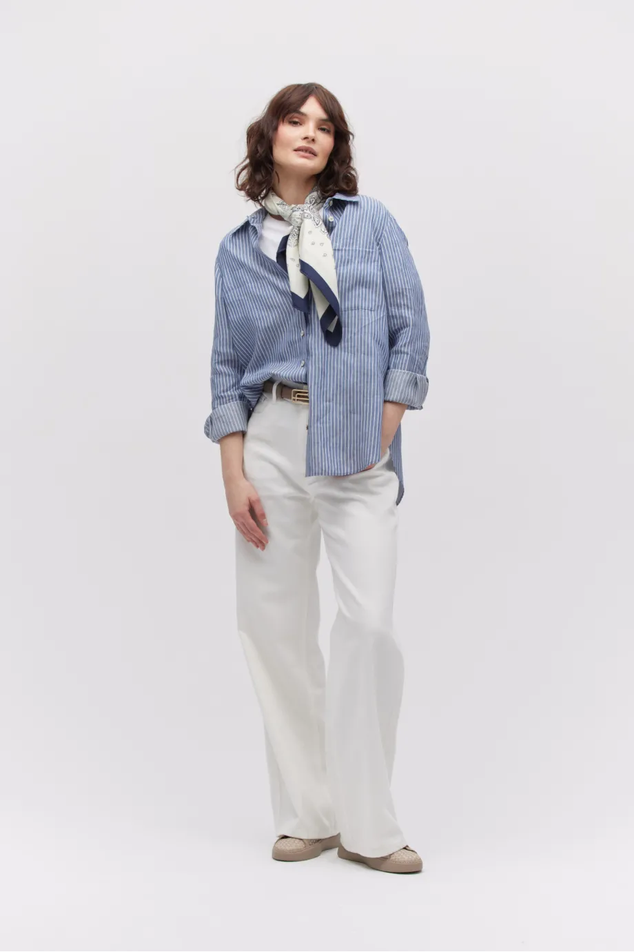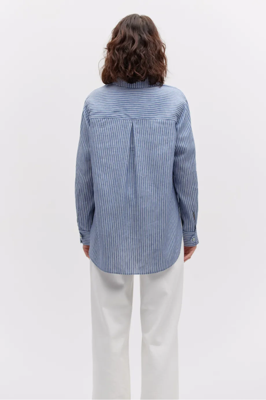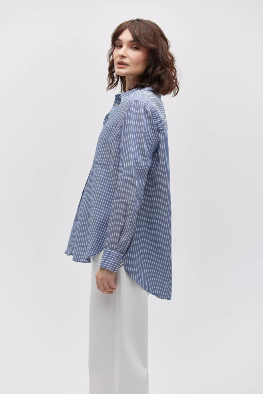Klassischer Kragen, lange Ärmel und Verschluss mit Perlmuttknöpfen.