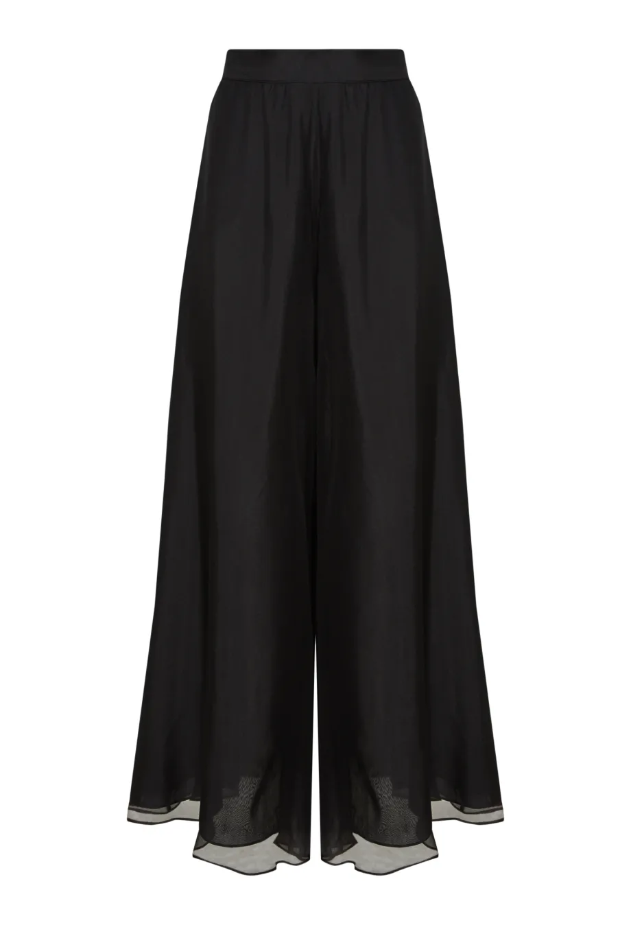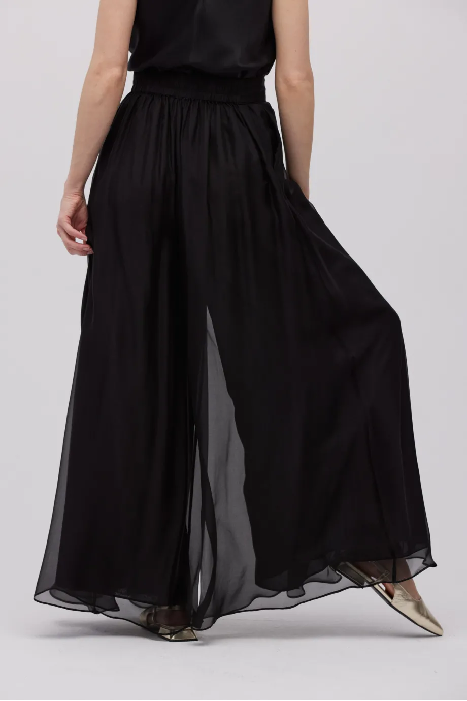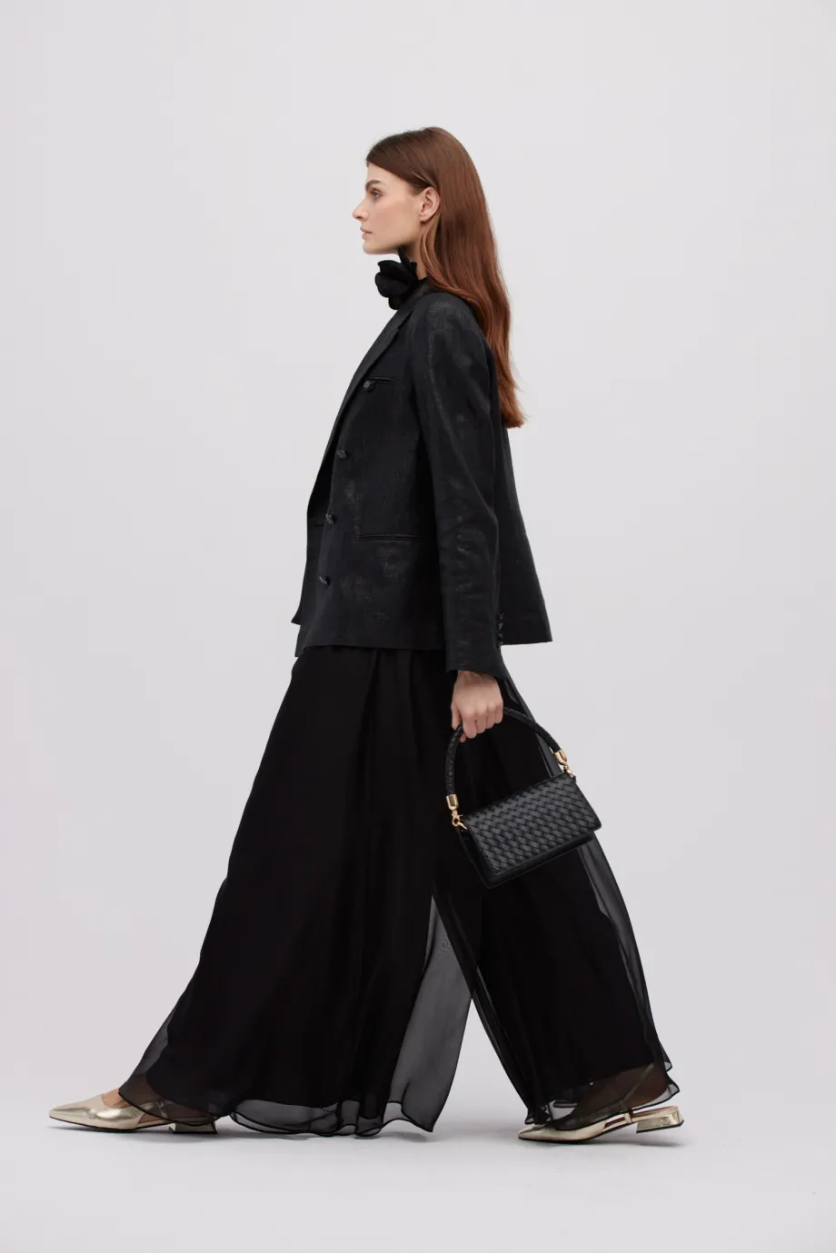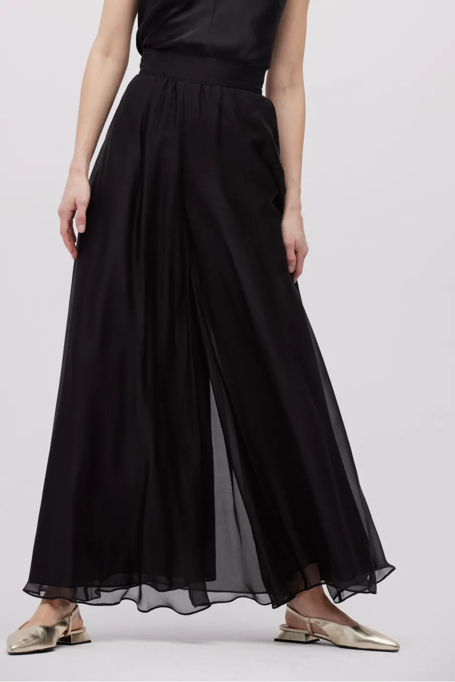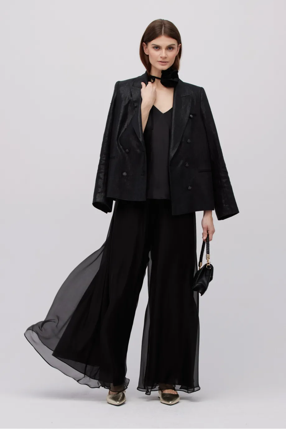 - Abgerundet wird das Outfit durch eine schwarze Seidenbluse