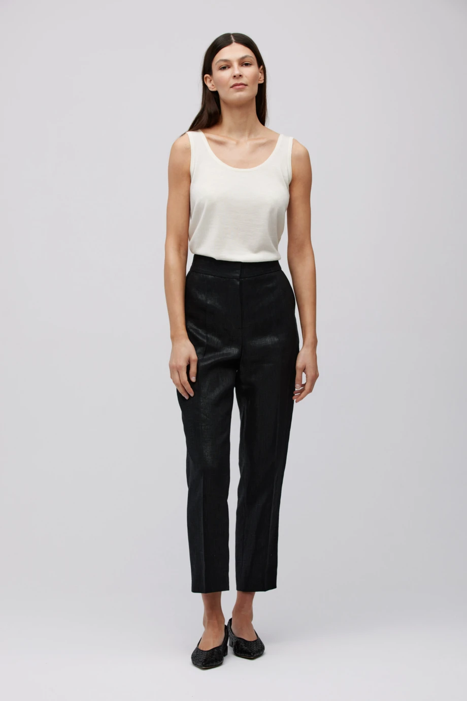 - Schwarze Hosen aus beschichtetem Leinen mit Abnähern für Bewegungsfreiheit im Hüftbereich
