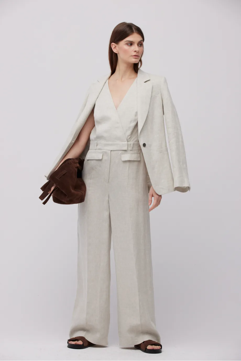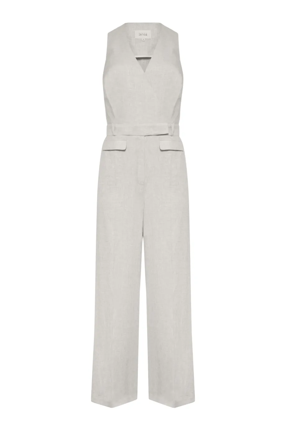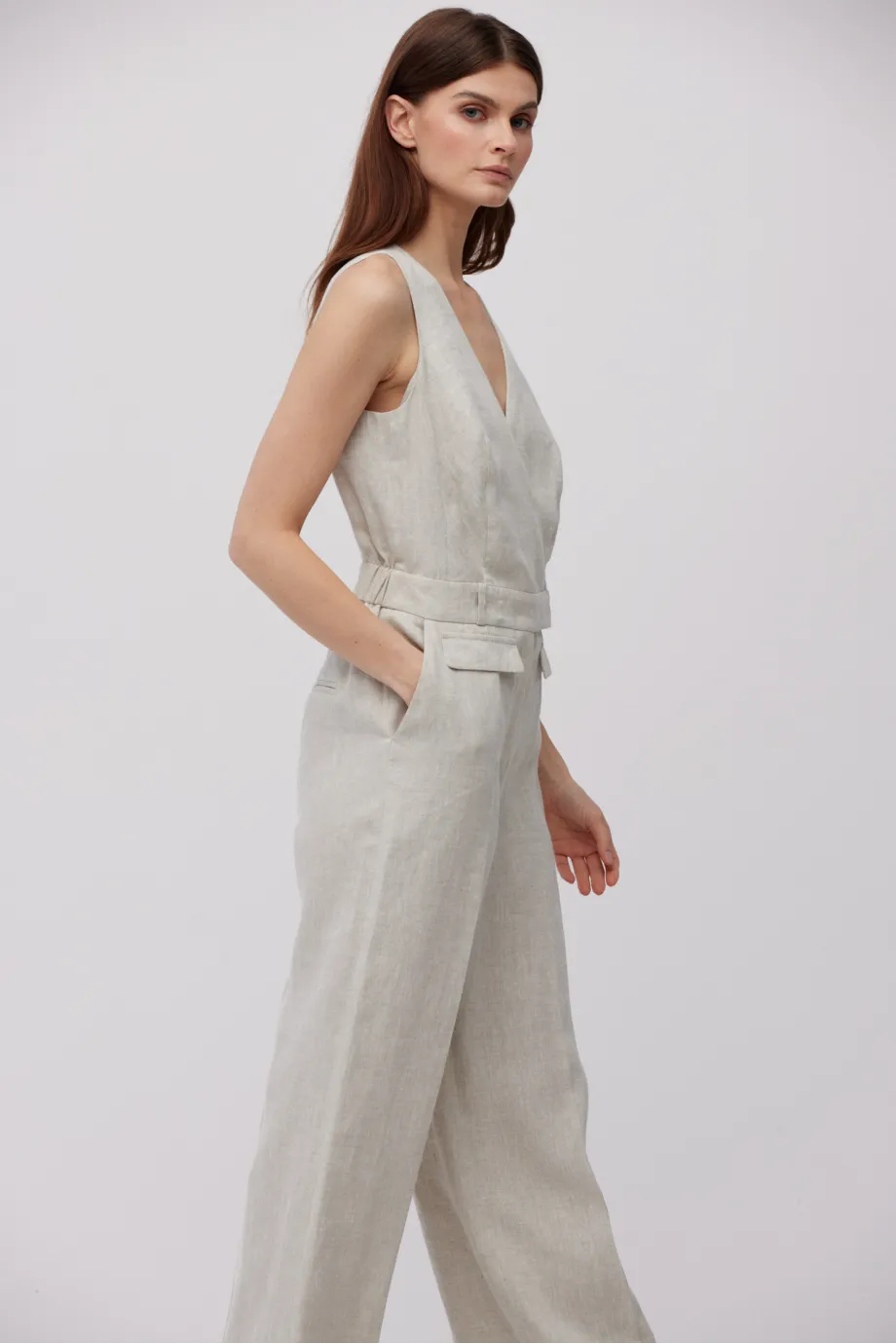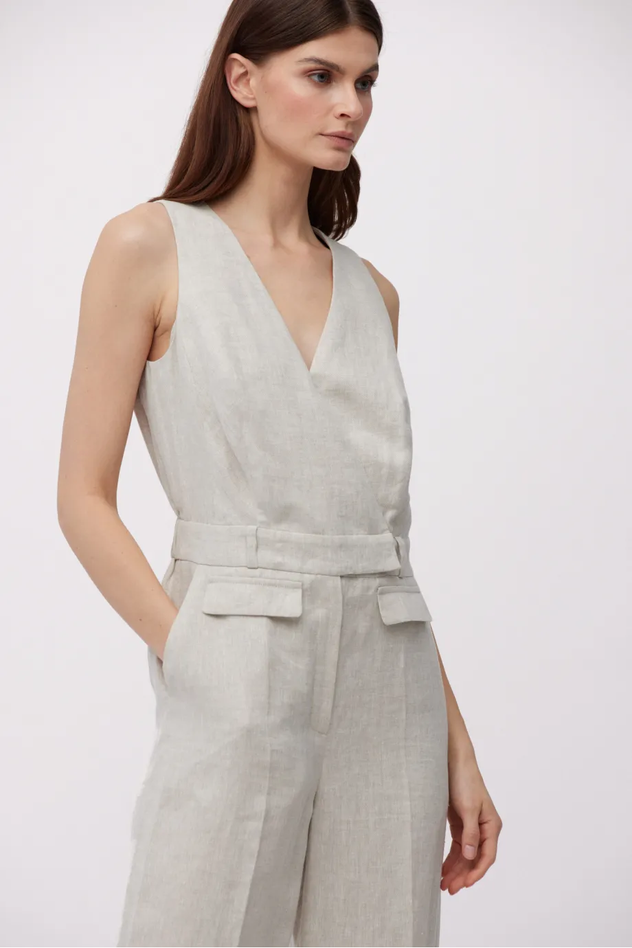 - Beiger Leinen-Overall mit V-Ausschnitt