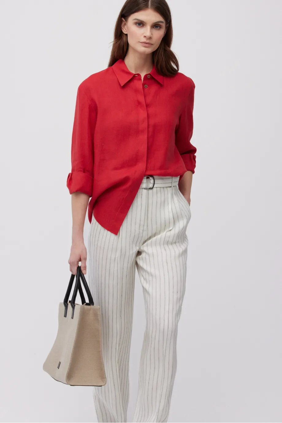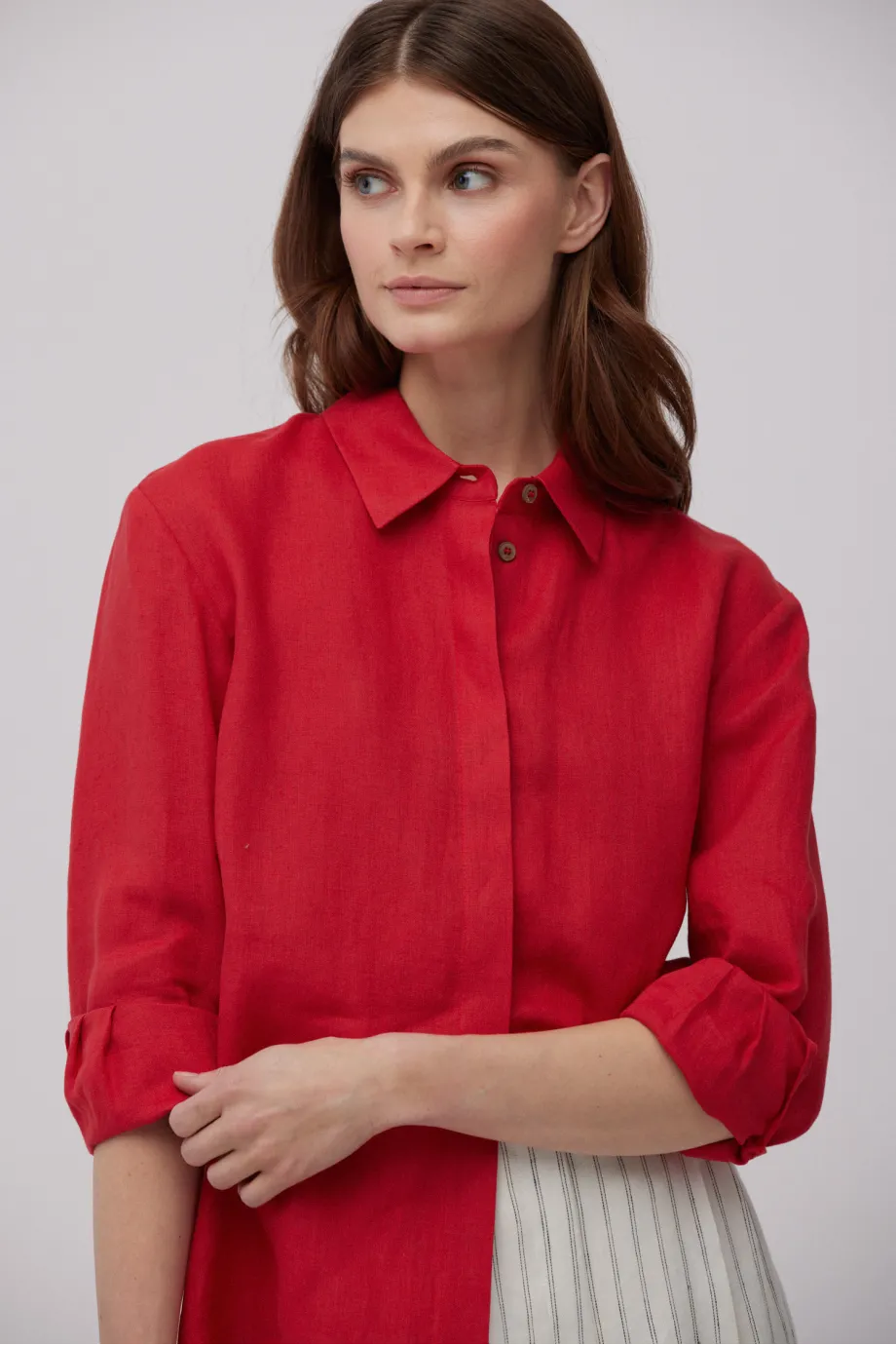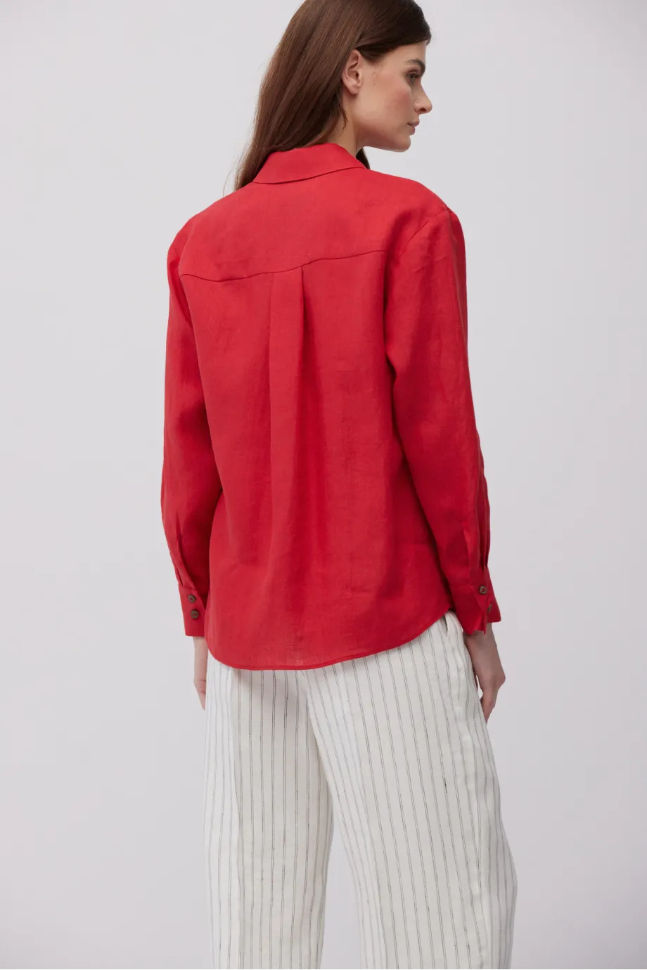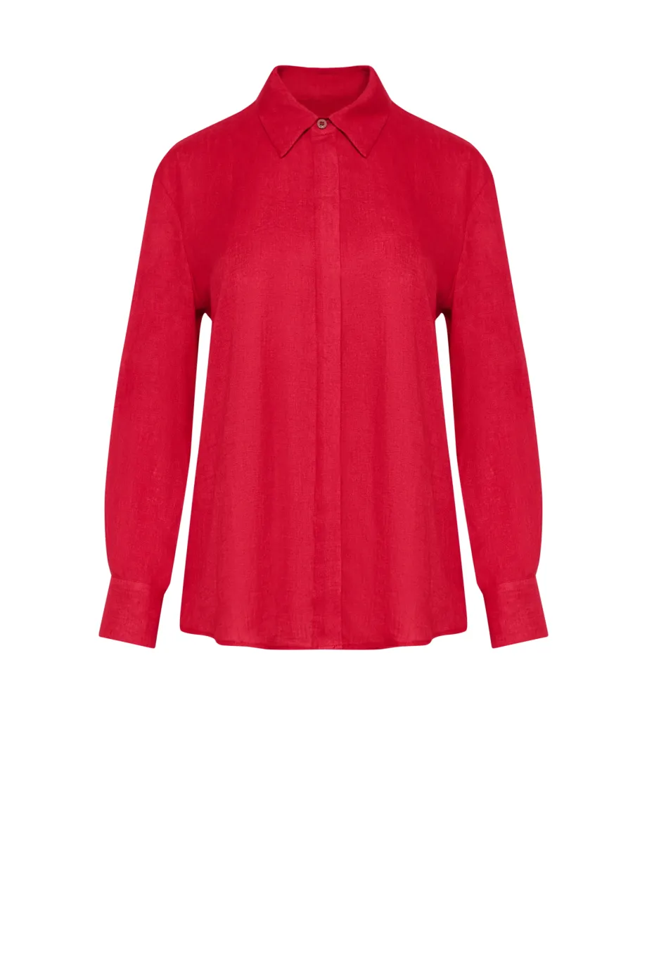 - Rotes Leinenhemd. Lockere Passform, lange Ärmel, klassischer Kragen