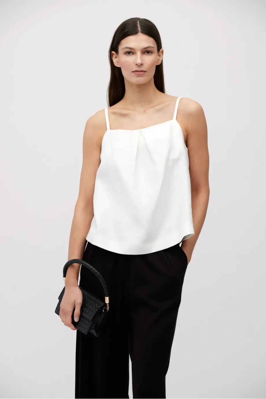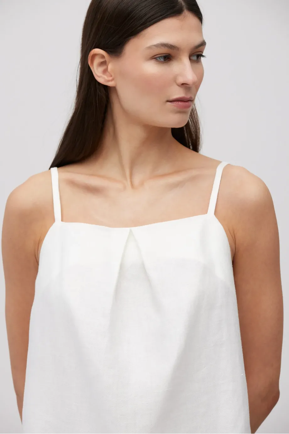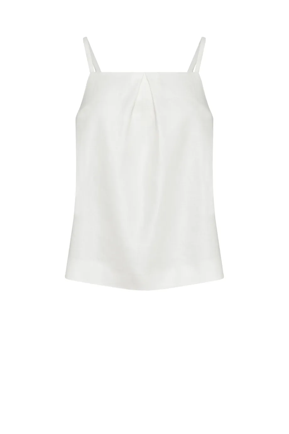 Weißes Leinen-Top. Lockerer, trapezförmiger Schnitt. Vorderseite mit Falte, Rückseite mit Wickel-Optik. Dünne Träger.