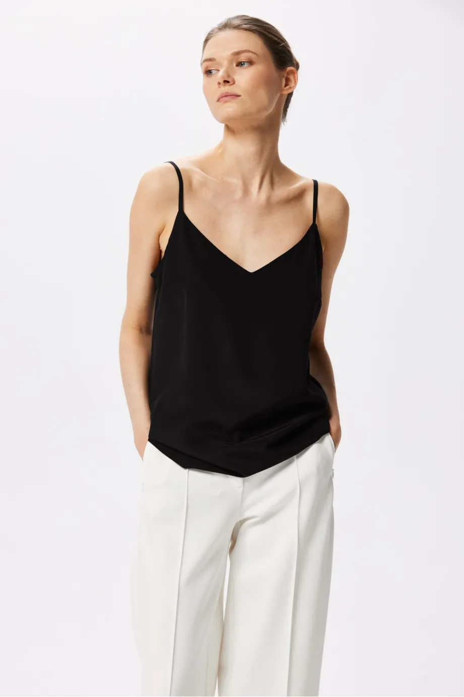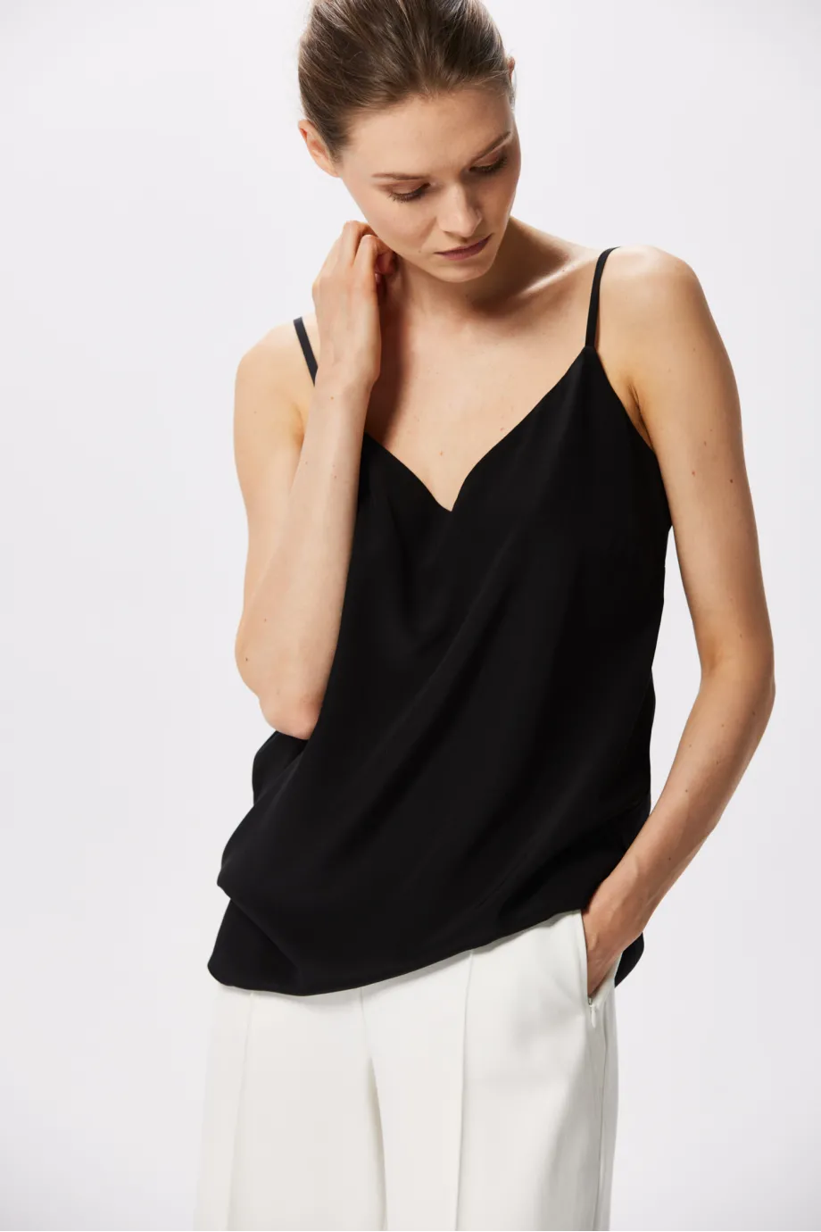 Die Seidenbluse mit Trägern ist unser Aushängeschild, das jede Saison in einer anderen Farbe erscheint. Diesmal gewinnt das kultige Top mit V-Ausschnitt einen tiefschwarzen Farbton. Es gibt keine Komposition, zu der es nicht passt, unabhängig vom bevorzugten Kleidungsstil. Das schwarze Seidentop mit Trägern ist ein unverzichtbares Basic im Kleiderschrank jeder Liebhaberin des Quiet Luxury-Trends.
