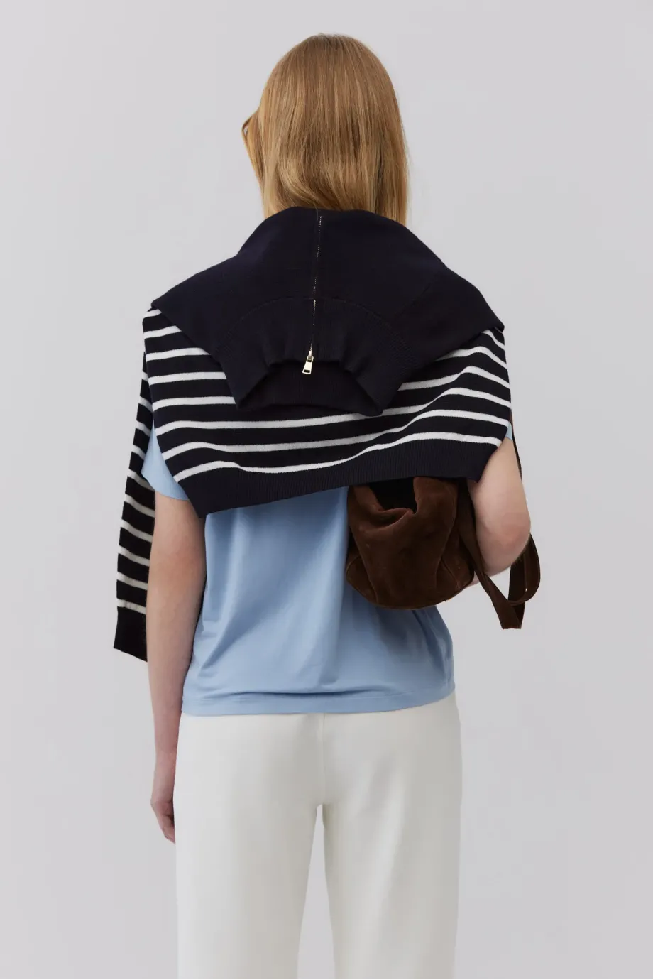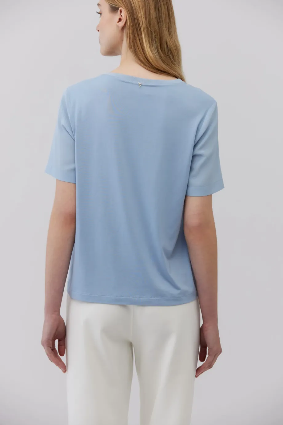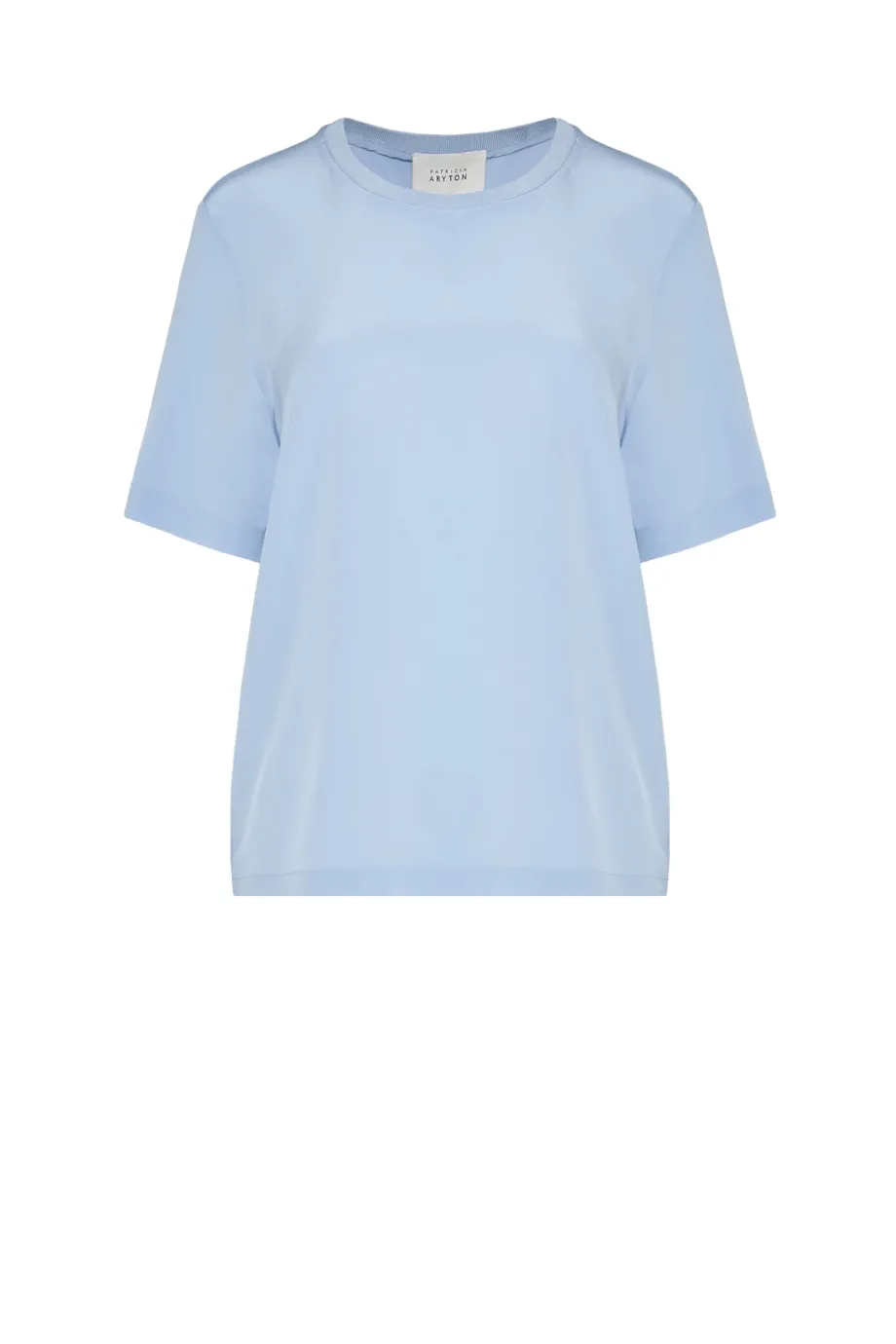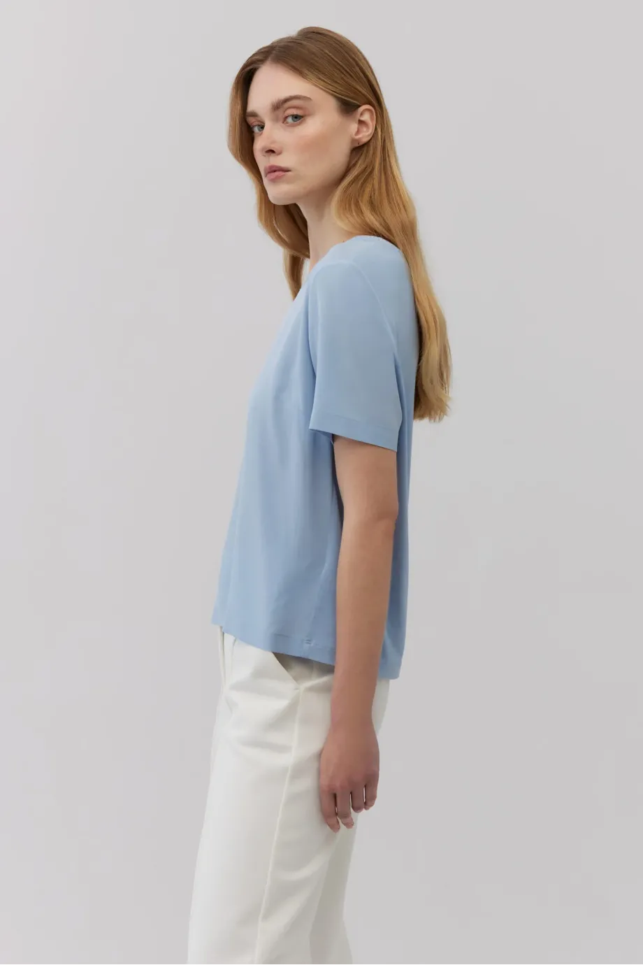 Bluse mit einer Vorderseite aus Seide und einem Rückenteil aus Strick. Gerader, leicht kastiger Schnitt. Rundhalsausschnitt. Kurze Ärmel.