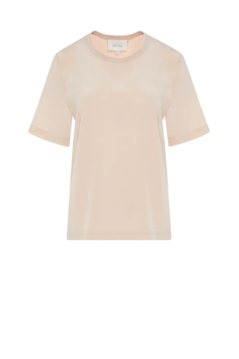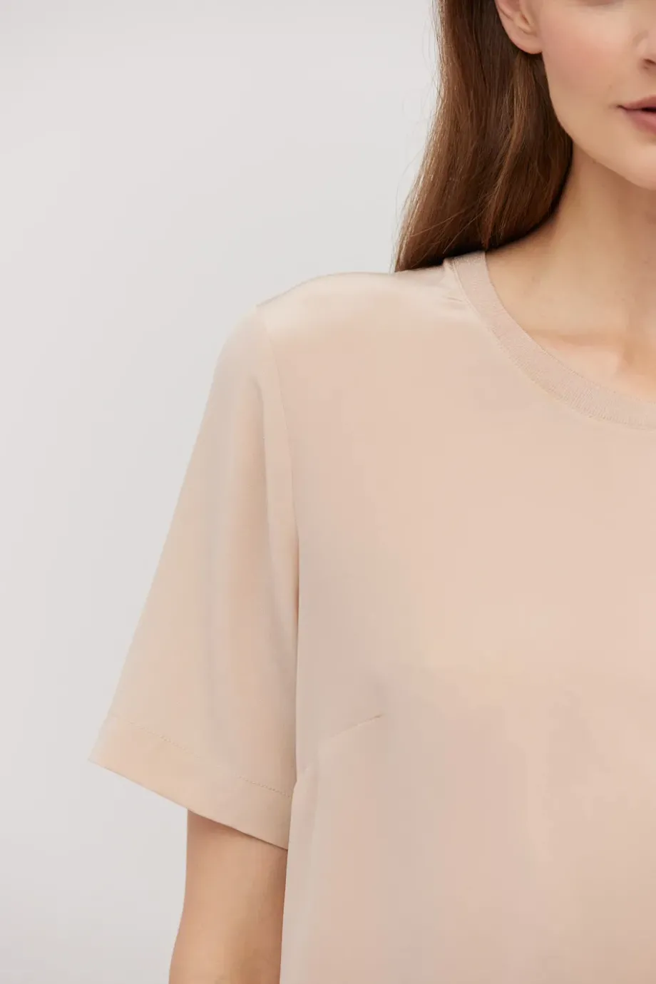 Bluse mit seidenfront und gestricktem Rücken. Gerader, leicht kastiger Schnitt. Rundhalsausschnitt. Kurze Ärmel.