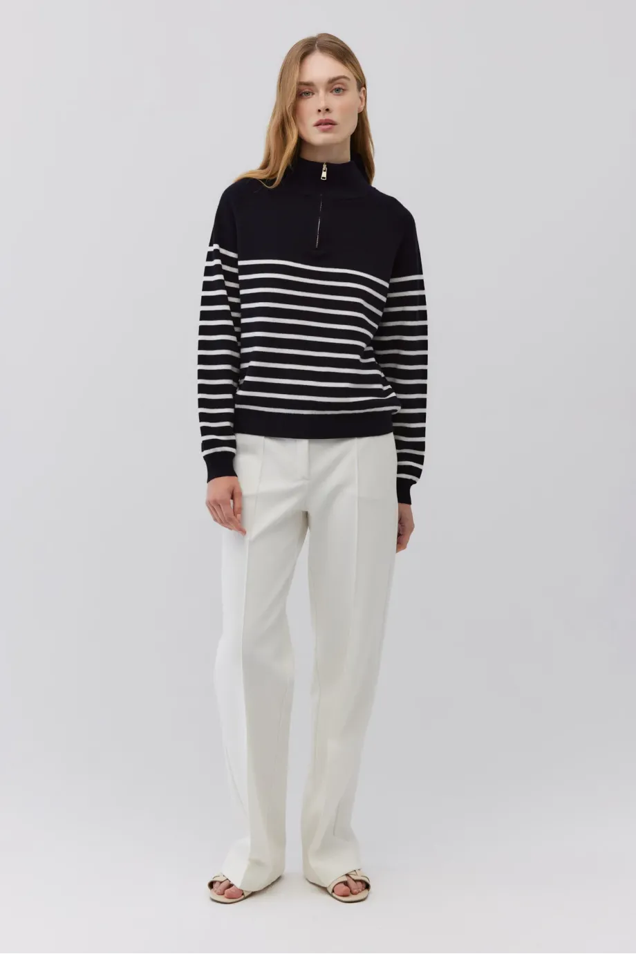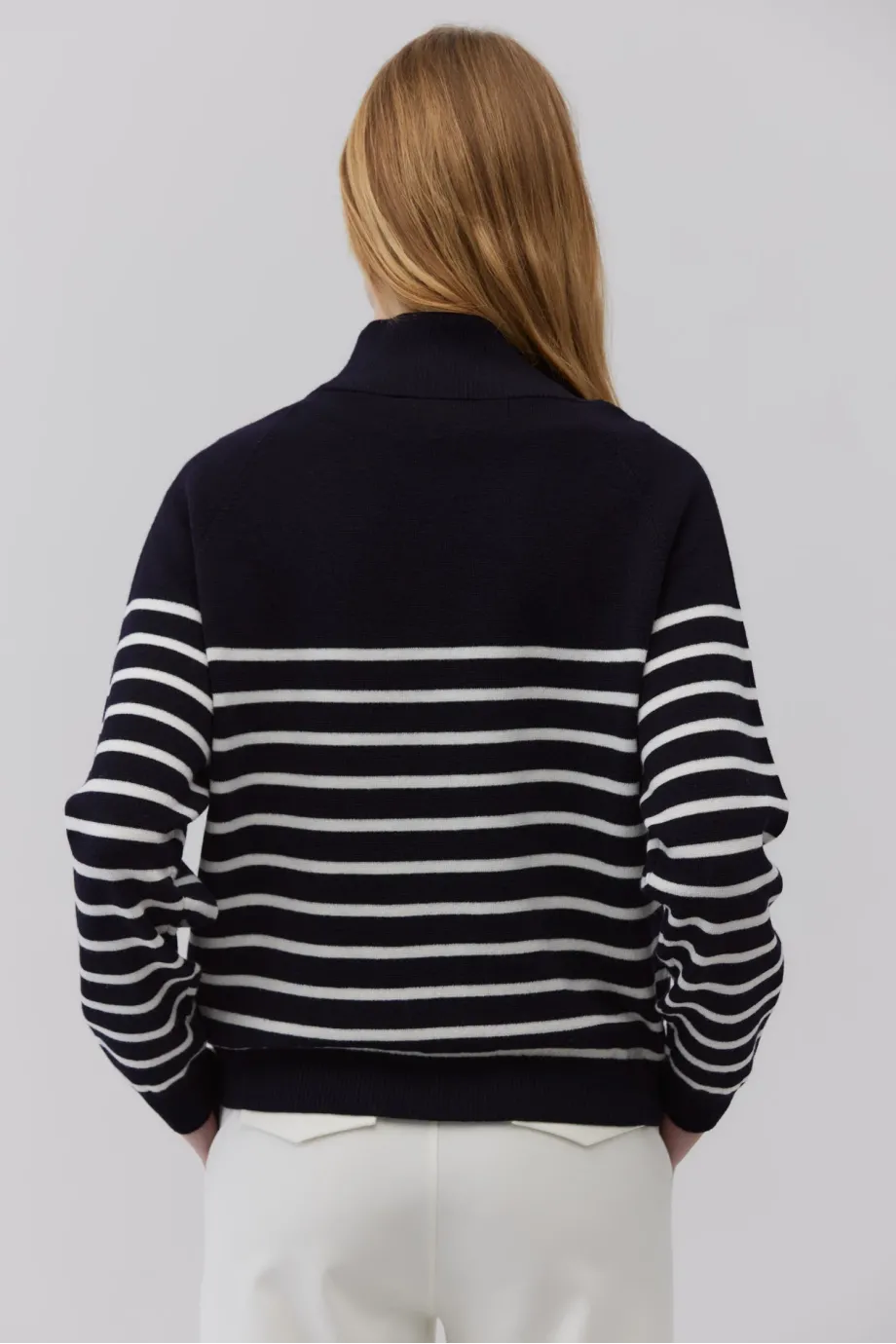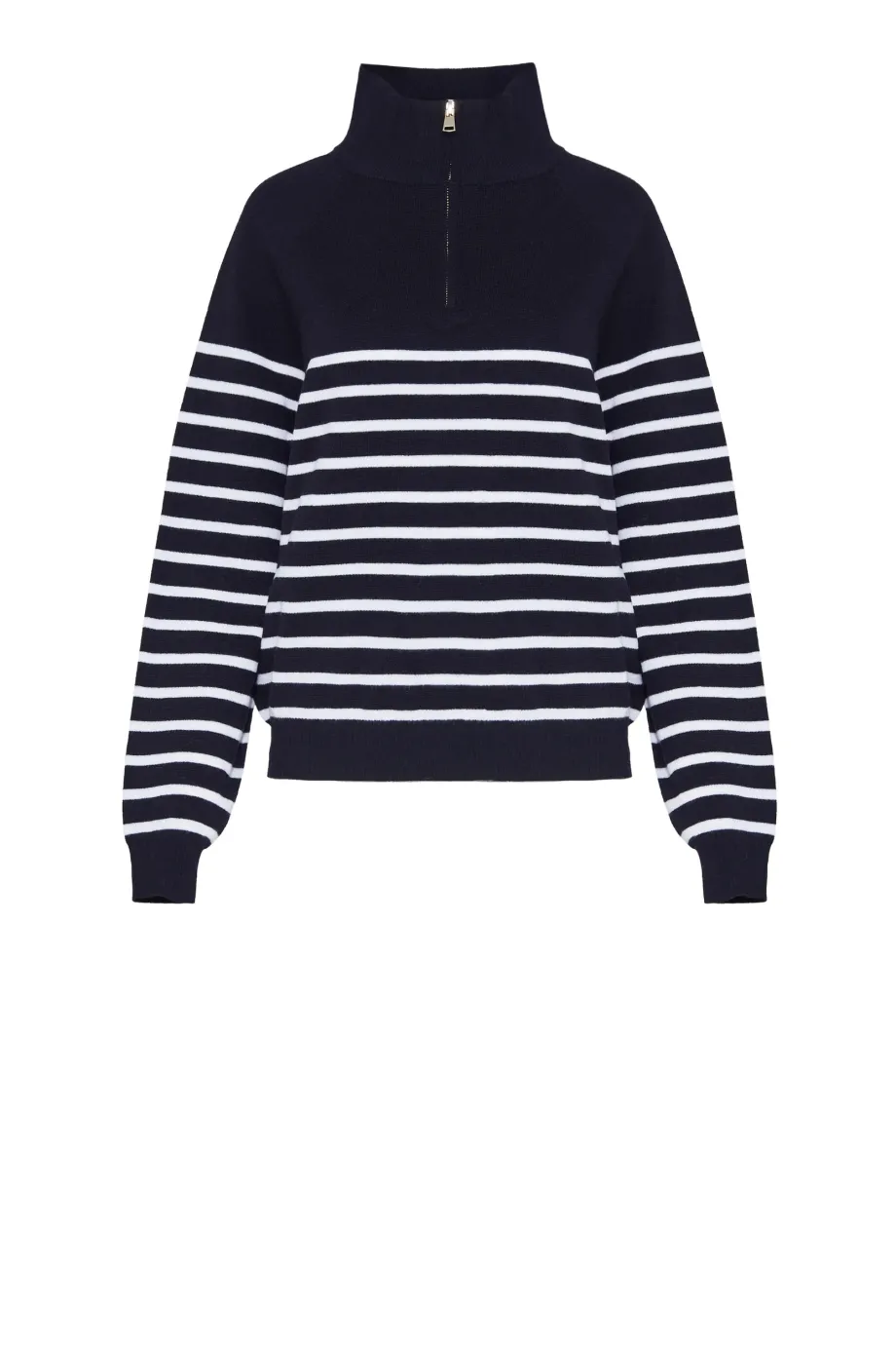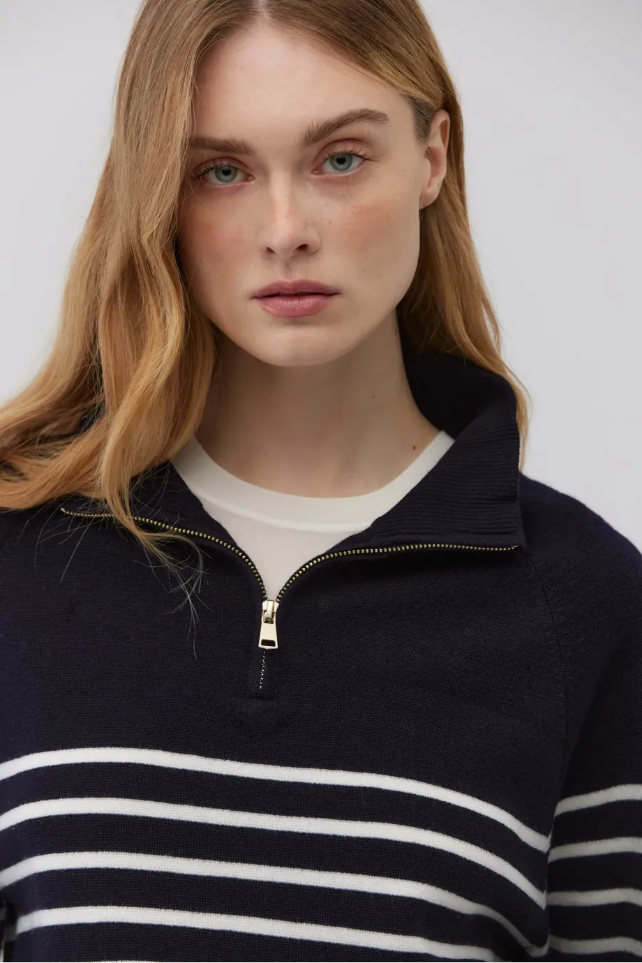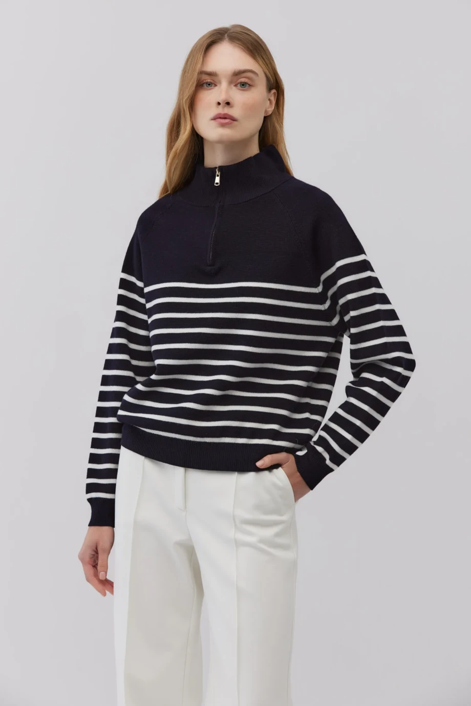 Marineblauer-weißer Pullover aus Merinowolle. Dichtes Gestrick mit tuck stitch Muster. Lockerer Schnitt mit hohem Stehkragen und Reißverschluss am Hals. Lange Ärmel mit Bündchen abgeschlossen.
