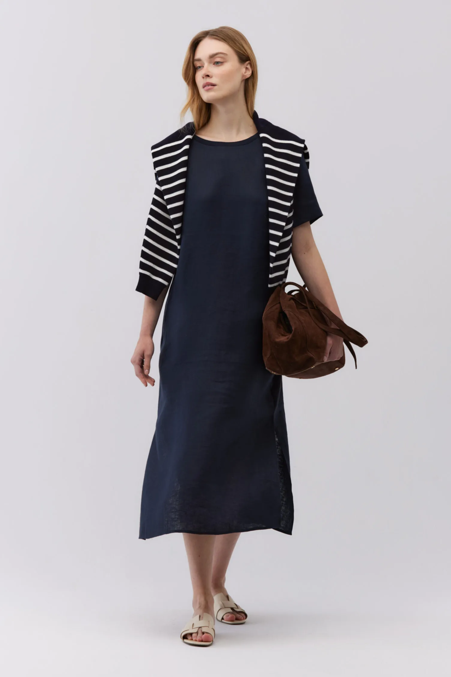 Langes Kleid mit kurzen Ärmeln. Gerader, lockerer Schnitt. Rundhalsausschnitt. Seitliche Schlitze. Taschen in den Seitennähten. Stoff 100% Leinen. Farbe marineblau.