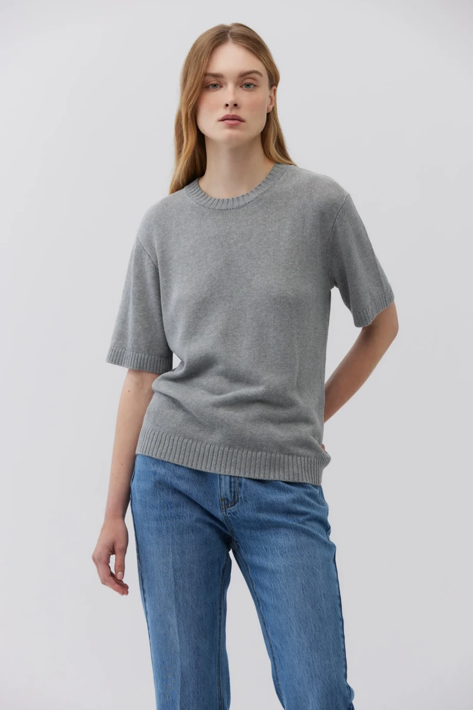 Graues T-Shirt mit kurzen Ärmeln. Rundhalsausschnitt. Schlichter, lockerer Schnitt. Weiches Strickmaterial aus einer Mischung von Lyocell, Baumwolle und Leinen. Lockeres Plain-Knit-Gestrick. Modell in 2 Farben.