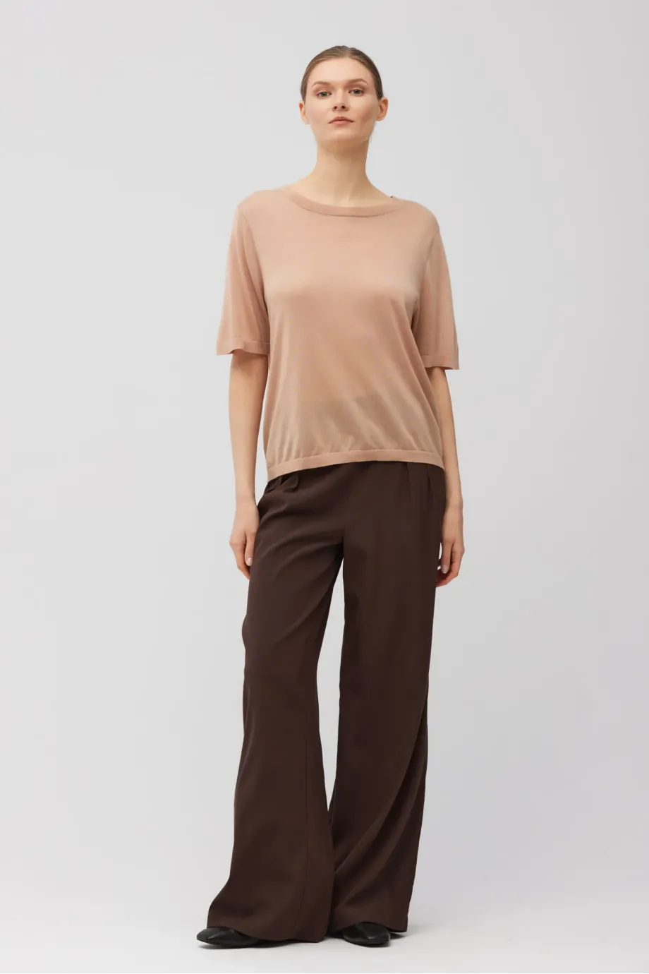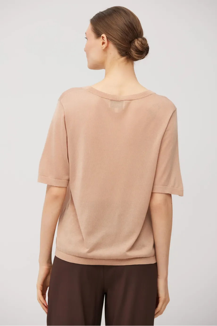 Strick-T-Shirt in puderrosa. Feine Mischung aus Kaschmir und Lyocell. Weicher und atmungsaktiver Stoff mit sehr feinem Single-Jersey-Gestrick, gefertigt auf einer Maschine mit 16 GG. Kurzer Ärmel, rundhals, klassische Form.