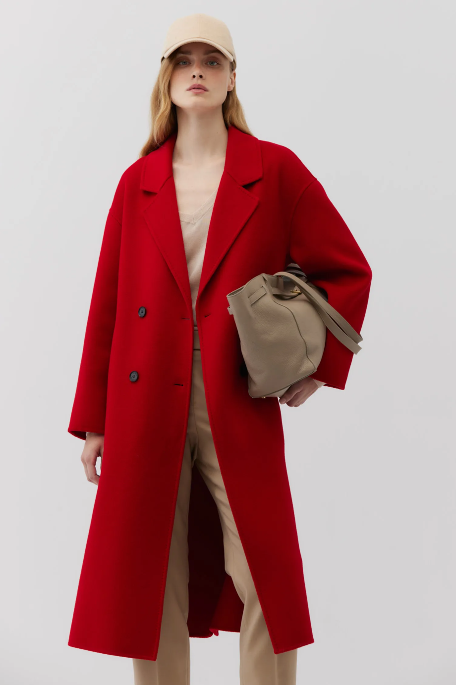Zweireihiger Mantel aus Doubleface-Gewebe – Mischung aus Wolle und Seide. Knielang, Taillengürtel, Kragen mit Revers. Leicht, ungefüttert. Rücken-Schlitz. Farbe Rot.