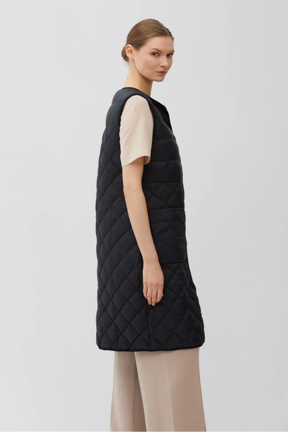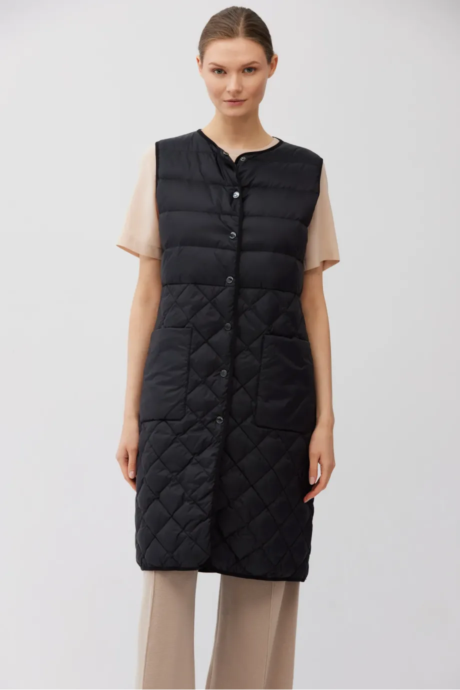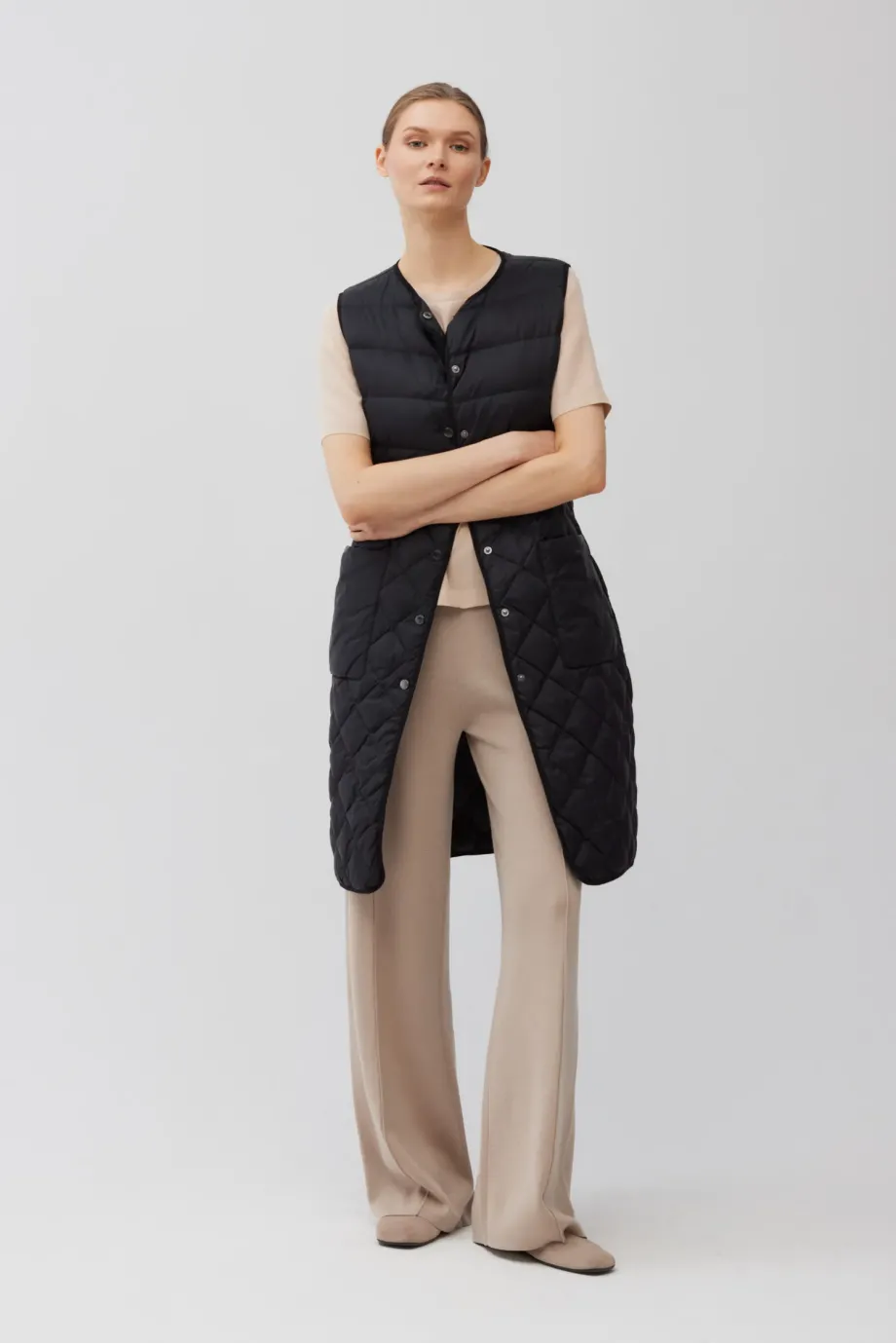 Leichte Weste mit natürlicher, daunenartiger Füllung. Mit Druckknöpfen zu schließen. Aufgesetzte Taschen vorne. Schlichte Passform – zum Alleintragen oder als Wärmeschicht unter dem Mantel. Farbe: Schwarz.