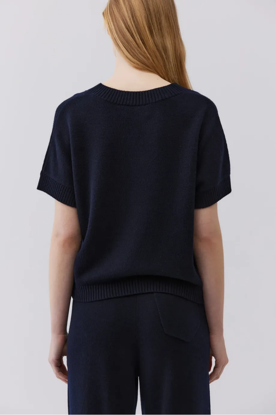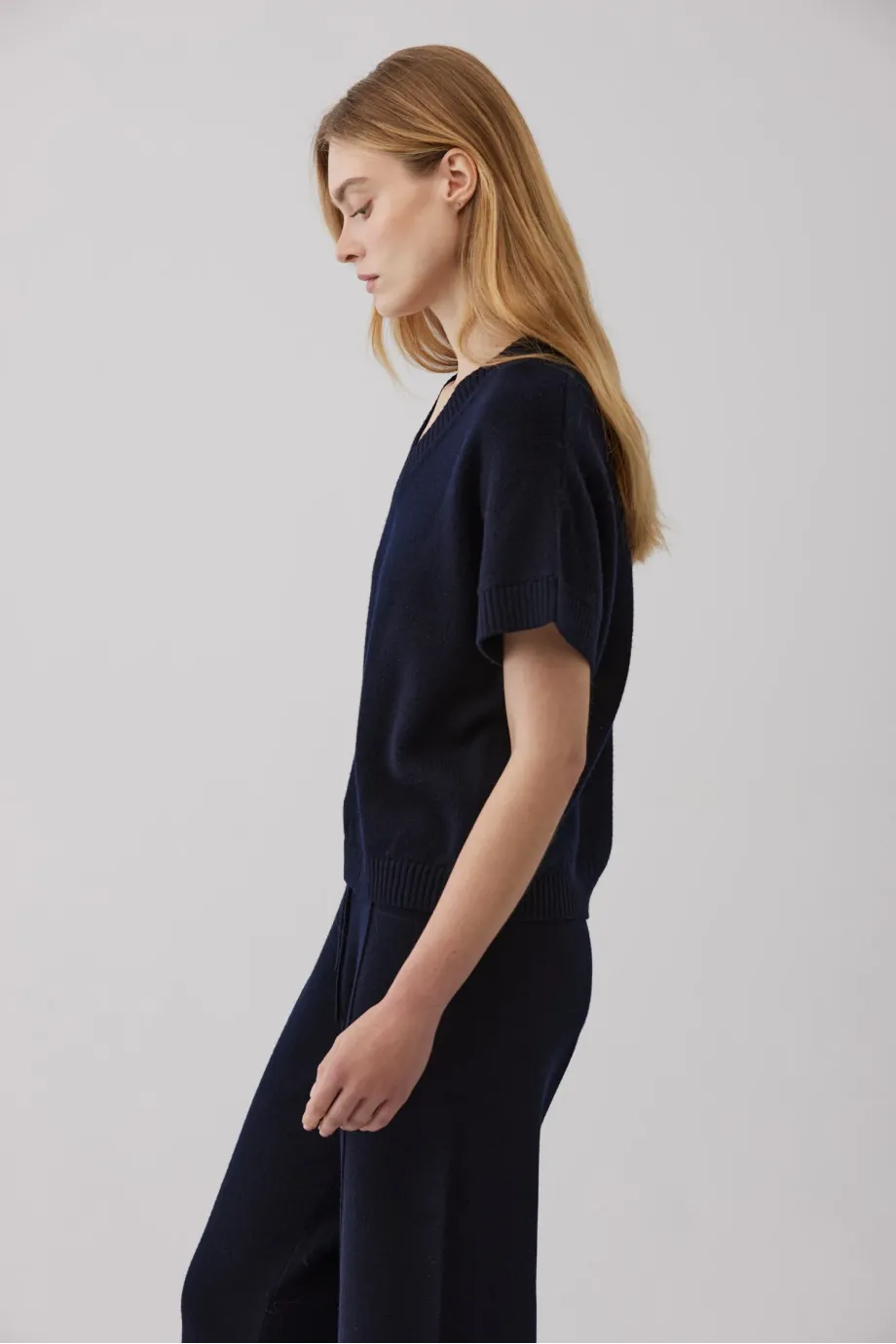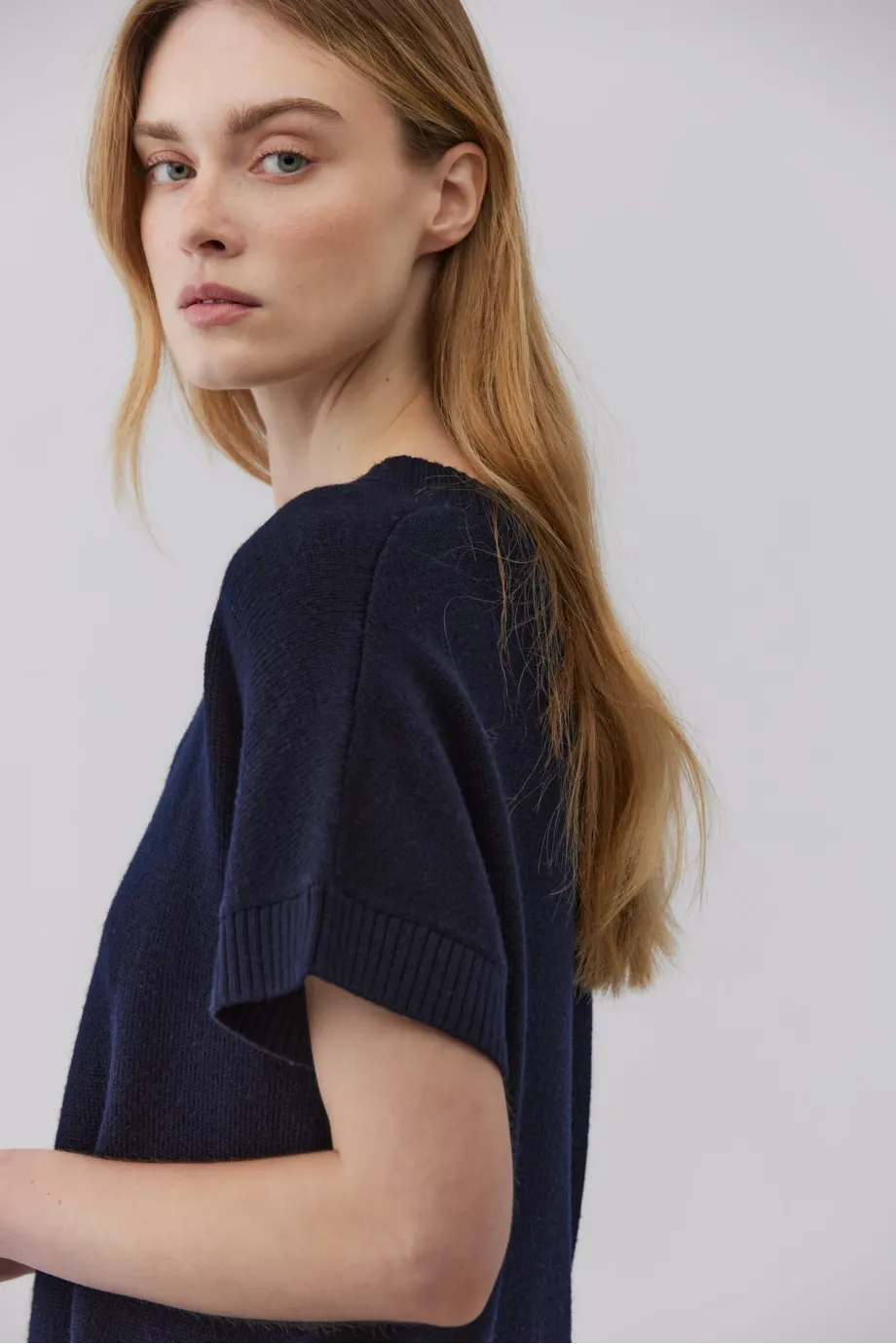 Marineblaue Bluse aus Merinowolle. Kurze Ärmel. Lockeres Single-Jersey-Gestrick. V-Ausschnitt. Ärmel und Saum mit Rippbündchen. Kastenform.