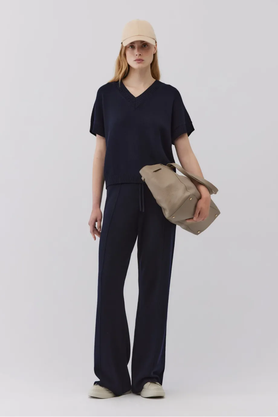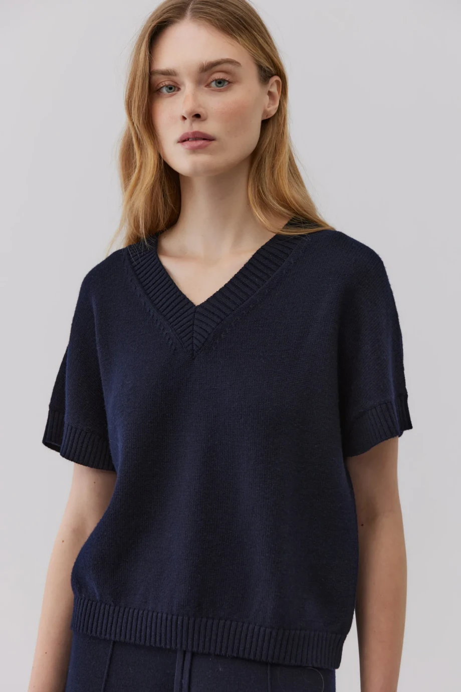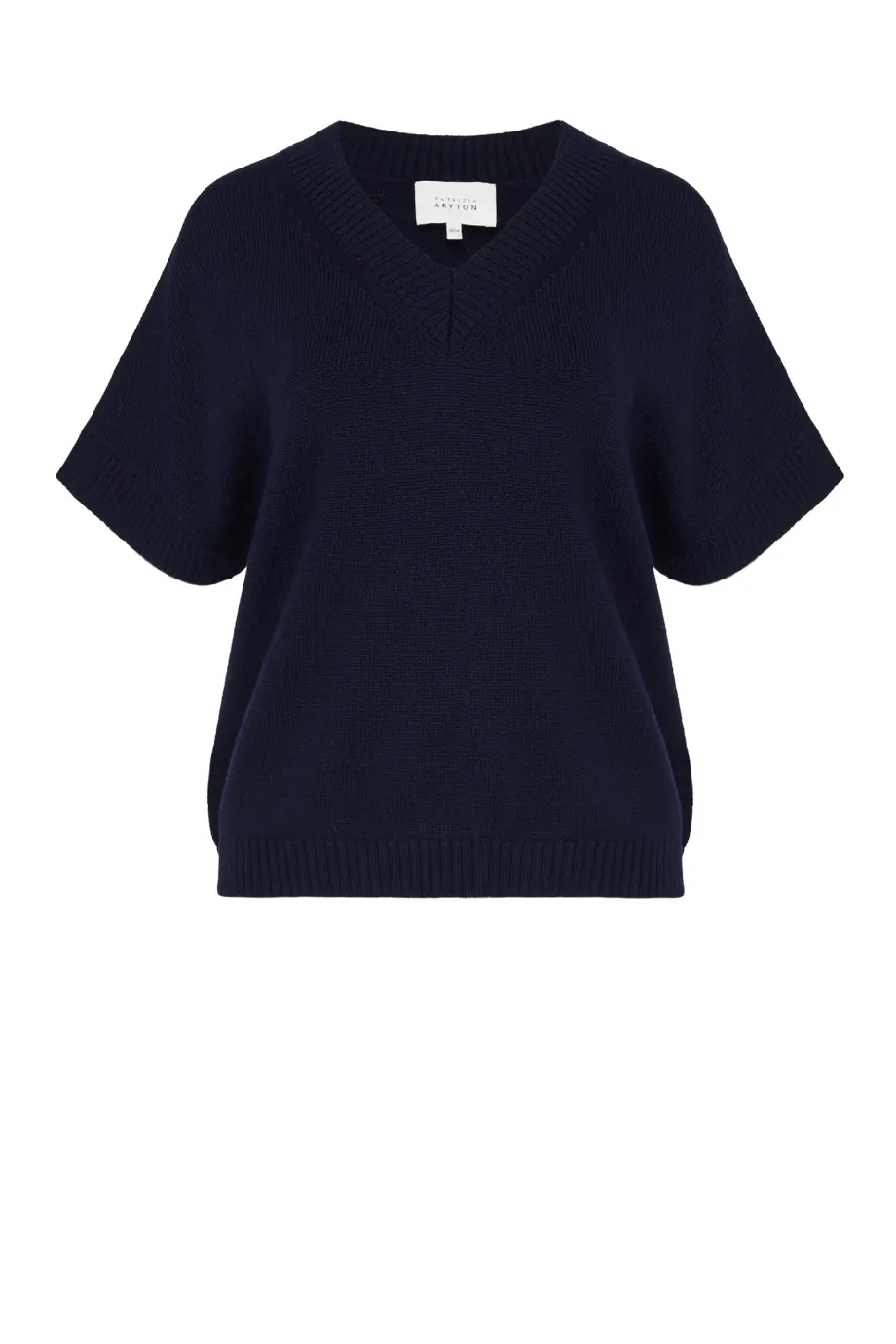 Marineblaue Bluse aus Merinowolle. Kurze Ärmel. Lockeres Single-Jersey-Gestrick. V-Ausschnitt. Ärmel und Saum mit Rippbündchen. Kastenform.