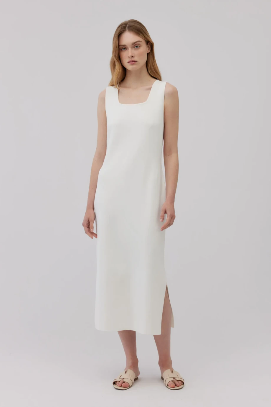 Weißes Kleid aus Strick. Dichtes Full Needle-Geflecht. Quadratischer Ausschnitt, breite Träger. Midi-Länge. Gerade, leicht taillierte Passform. Seitlicher Schlitz. Minimalistische Ästhetik.