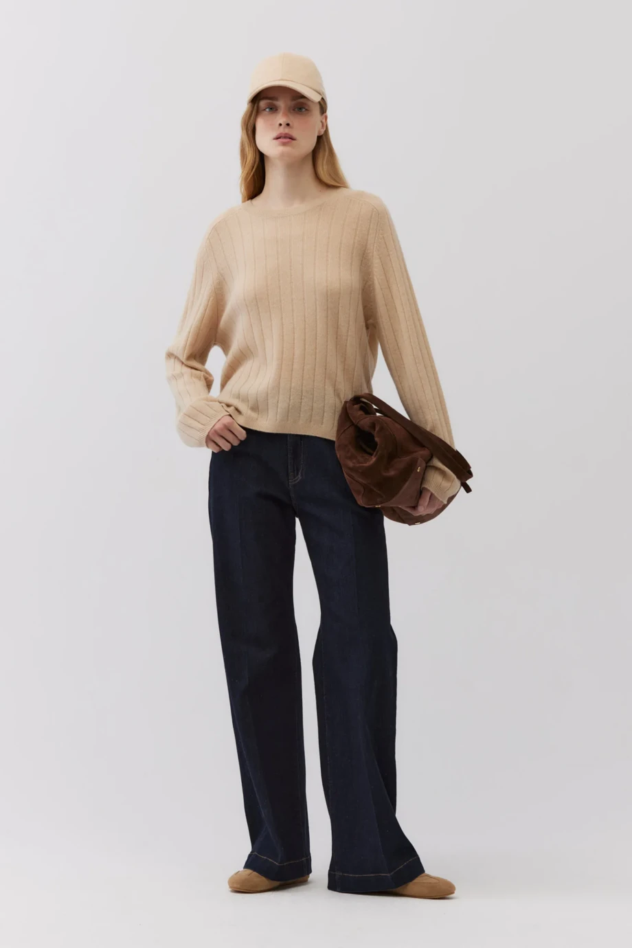 Gestreifte Bluse aus Kaschmir. Rundhalsausschnitt, langer Ärmel. Rippenstrick. Beige Farbe. Lockere Passform.