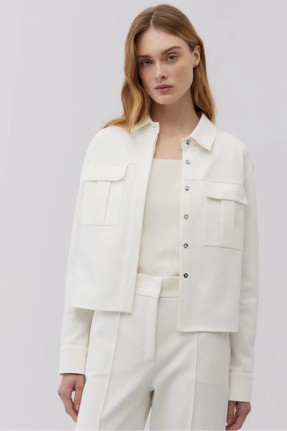 Weißer Blazer im Hemdenstil. Schlichte, leicht kastige Passform. Taschen mit Klappen. Druckknopfverschluss. Passend dazu Hose.