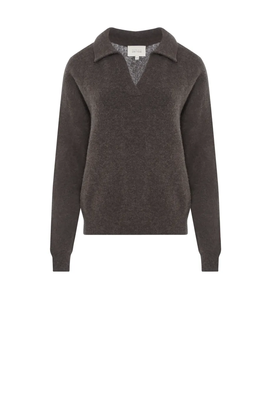 Kurze Form mit langen Ärmeln und V-Ausschnitt. Hergestellt in single jersey-Strickart an einer Maschine mit einer Maschenweite von 7 GG. Weiche Strickware mit Alpakawolle. Farbe: gedämpftes Braun.