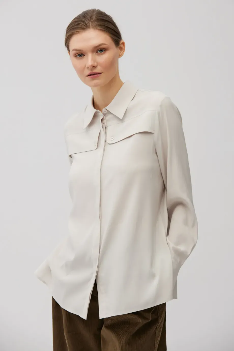 Seidenhemd. Lockerer Schnitt. Klassischer Kragen. Lange Ärmel mit Manschetten. Mit Knöpfen verschließbar. Beige Farbe.