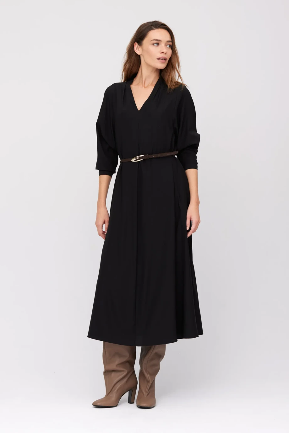 Schwarzes Midikleid aus Seide. Leicht ausgestellter Schnitt mit V-Ausschnitt. 3/4-Ärmel mit Knopfverschluss. Tiefe Seitenschlitze. Rücken mit Knopfverschluss. Taschen in den Seitennähten.