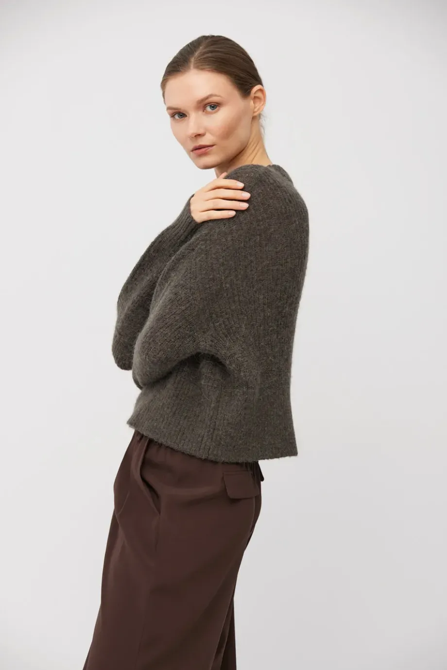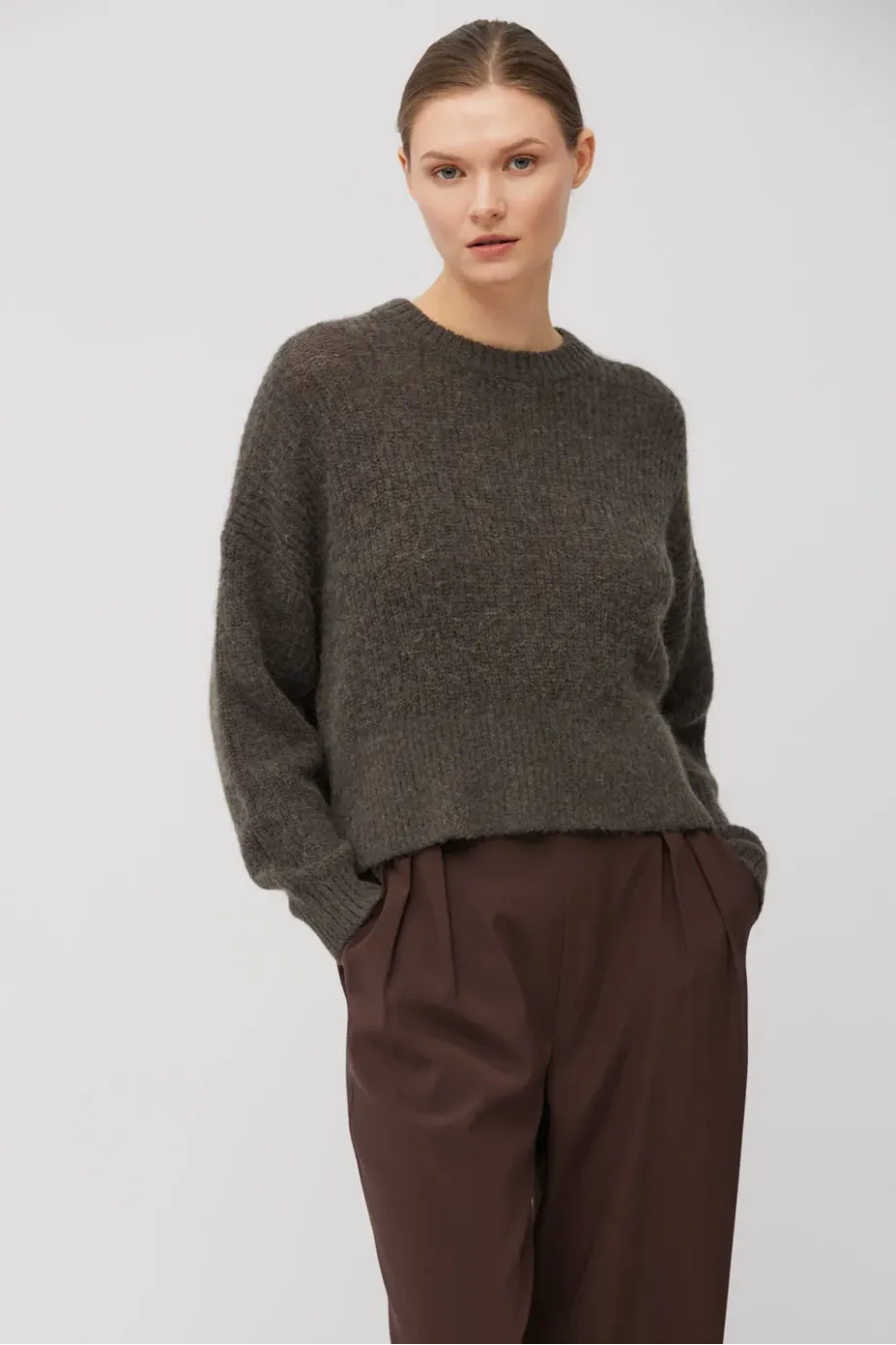 Schnitt mit rundem Ausschnitt und langen Ärmeln. Aus plain knit Masche gefertigt an einer 3 GG Maschine. Strickware mit Alpaka-Wolle – warm und flauschig. Farbe: gedämpftes Braun.