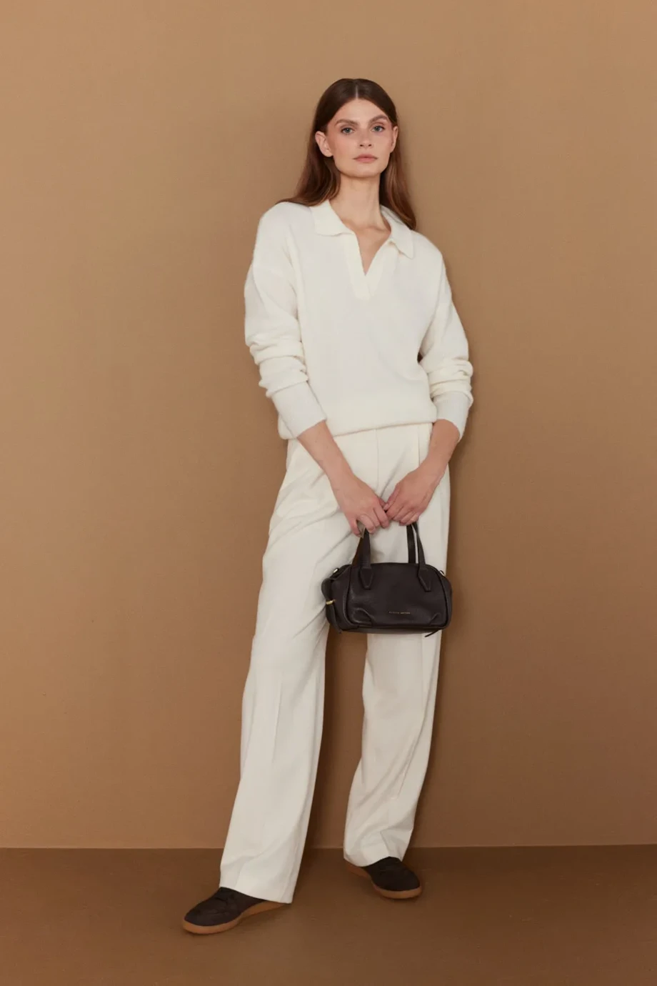 Kurzes Modell mit langen Ärmeln und V-Ausschnitt. Gefertigt im Single-Jersey-Strick mit einer Feinheit von 7 GG. Weiches Strickmaterial mit Alpakawolle. Farbe: Creme.