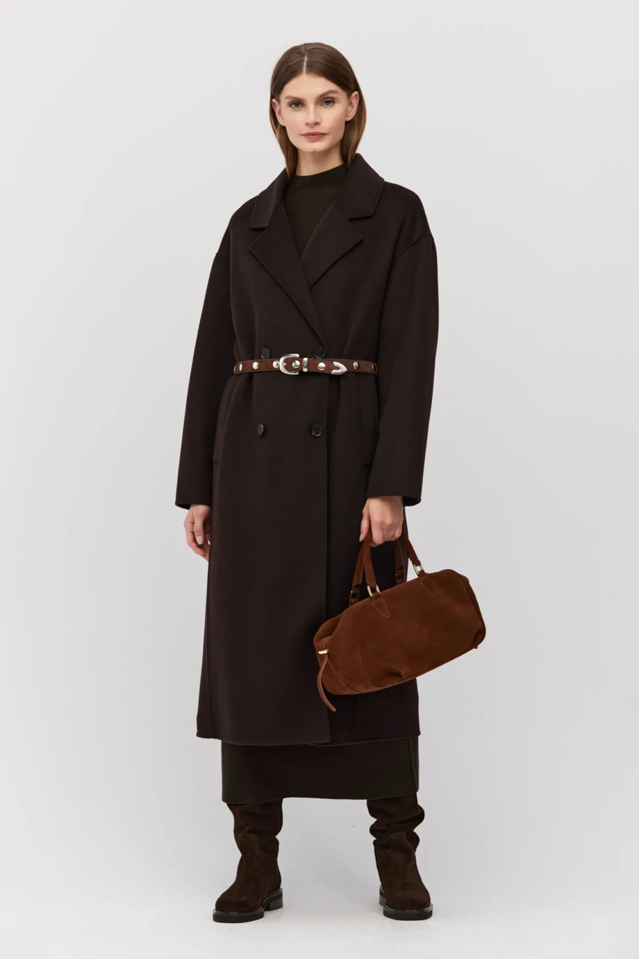 Zweireihiger Mantel aus Doubleface-Stoff – einer Mischung aus Wolle und Seide. Knielang, mit Gürtel in der Taille, Reverskragen. Leicht, ungefüttert. Schlitz hinten. Farbe: Braun.
