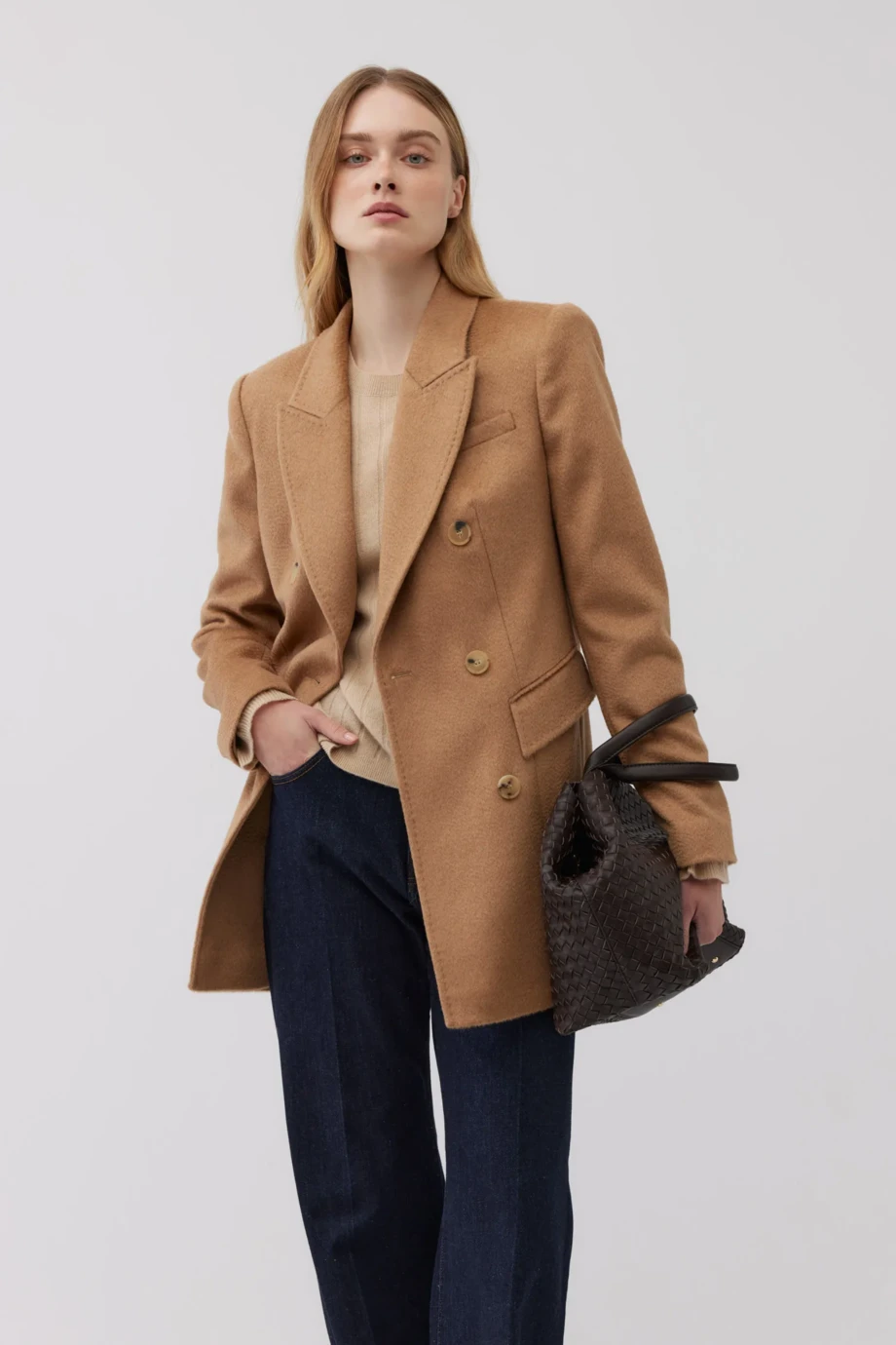 Jacke aus Kamelwolle, leicht tailliert. Markante Schulternlinie. Komplett mit Futter. Rücken mit Schlitz. Ziersteppungen und Paspel. Außere Knöpfe aus natürlichem Horn, innere – aus natürlicher Korbnuß. Farbe natur camel.