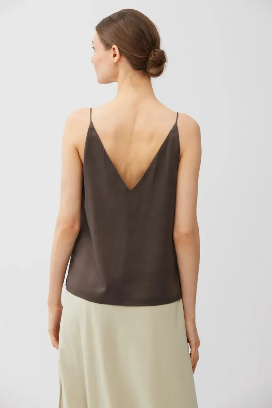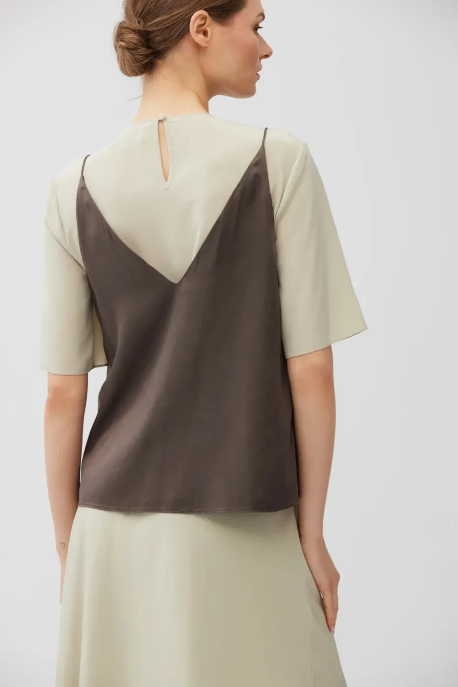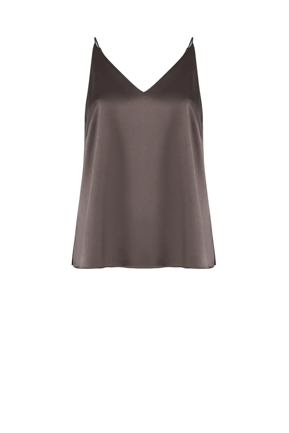 Seidentop. Lockere Form. V-Ausschnitt. Dünne Träger. Farbe braun.
