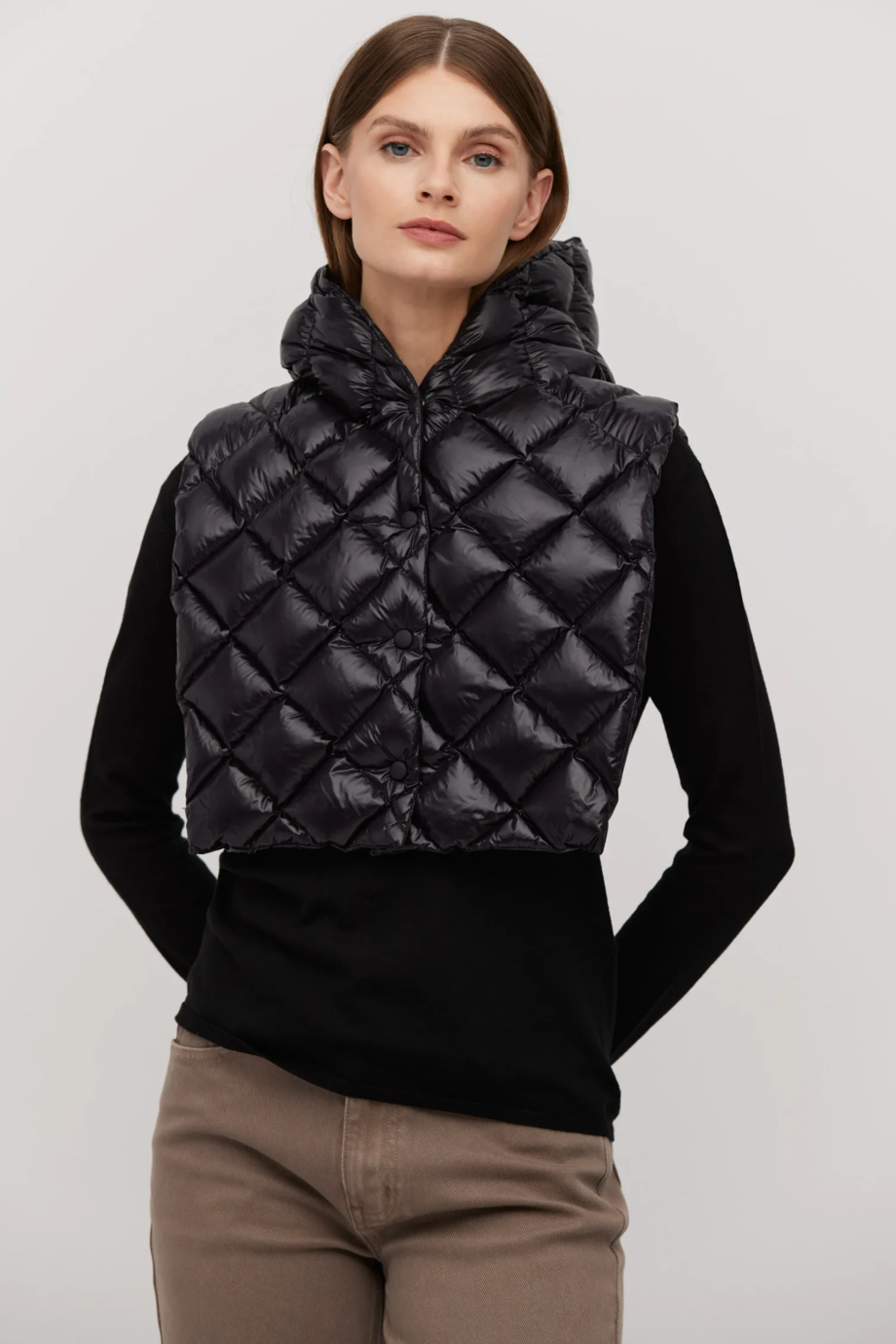 Schwarze Kapuze mit natürlicher Füllung, Einheitsgröße. Vorne mit Druckknöpfen verschließbar, dient als zusätzliche Wärmeisolierung für den Mantel.