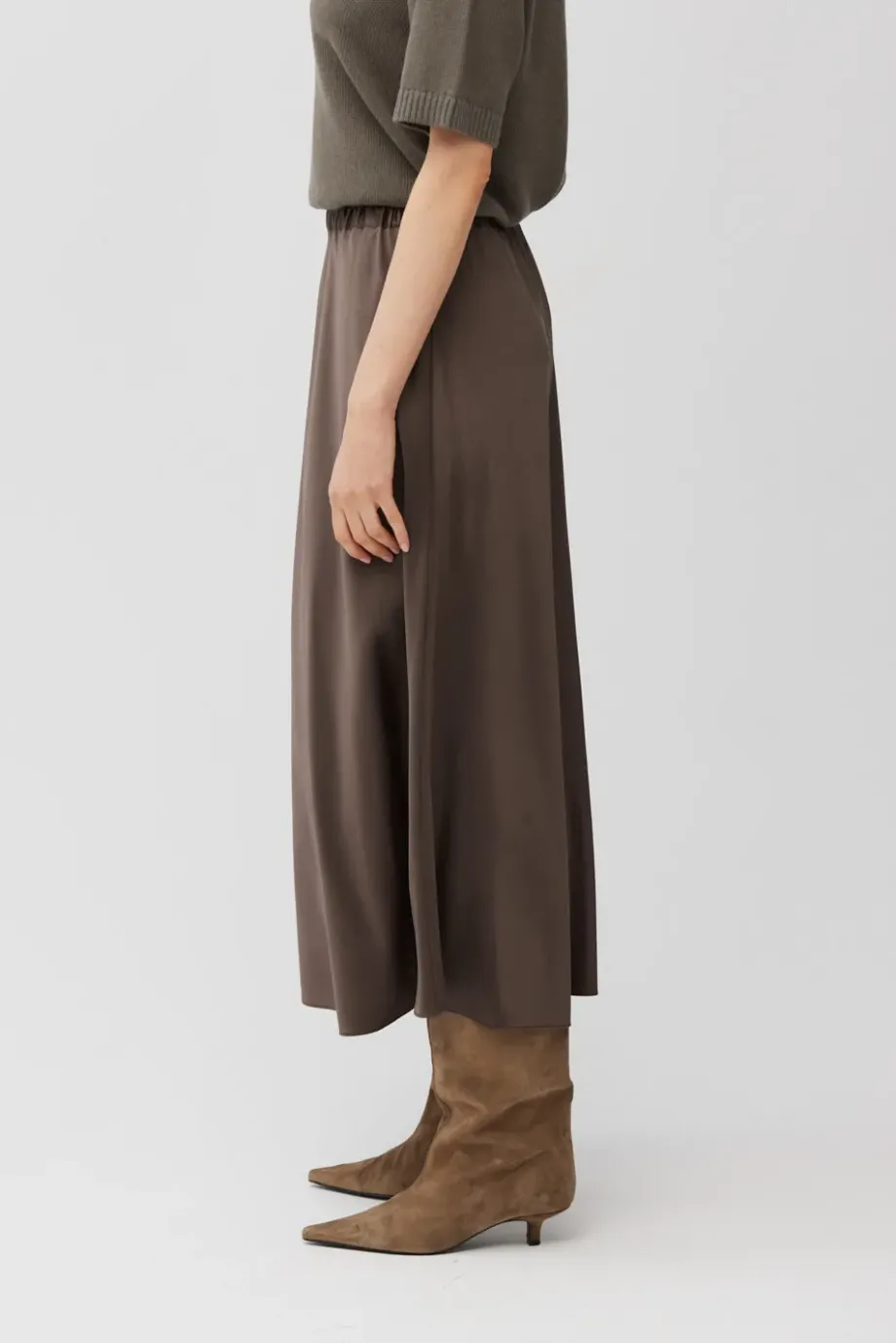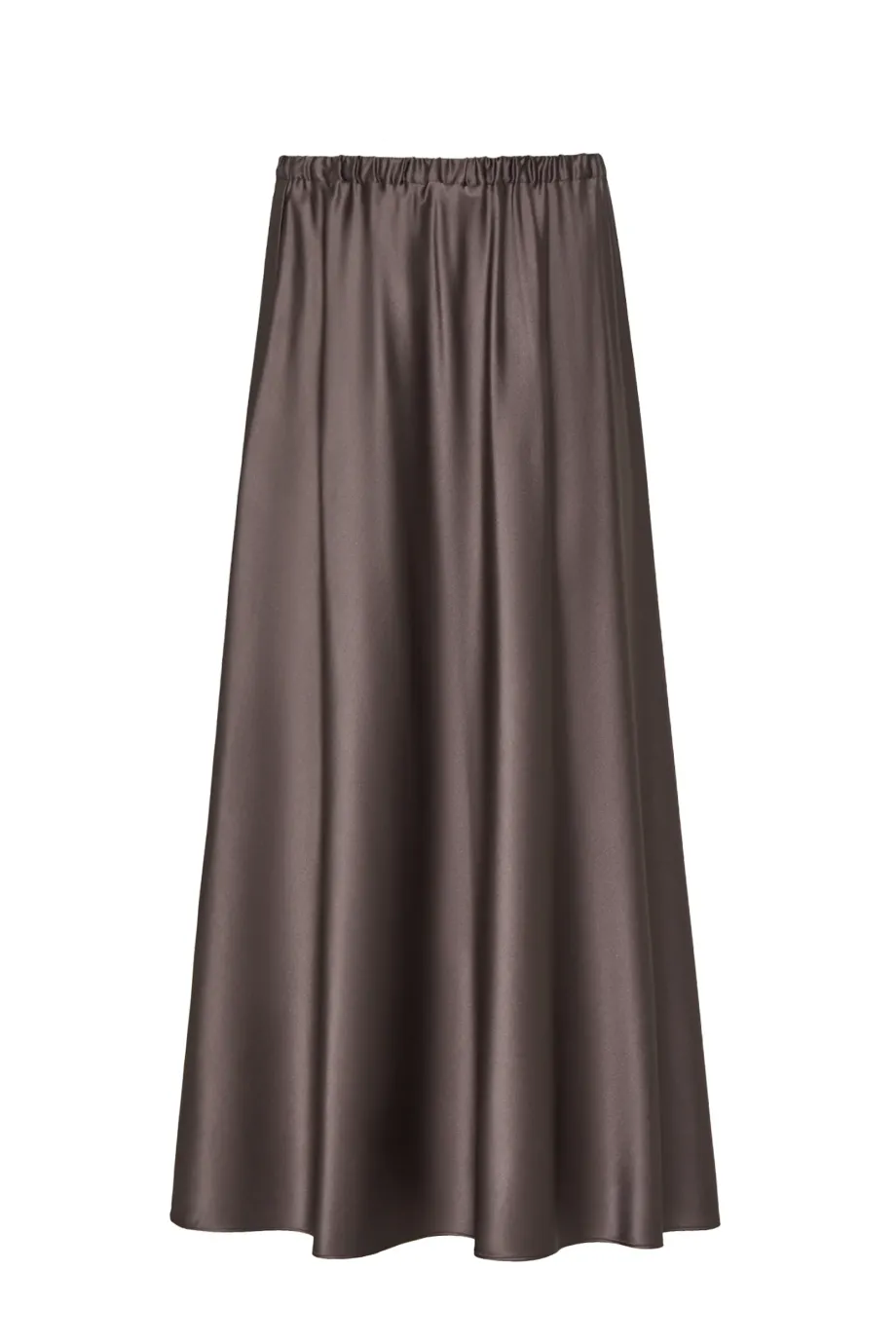 Seidenrock in Braun. Luftig, locker geschnitten mit elastischem Bund. Midi-Länge. Ohne Futter.