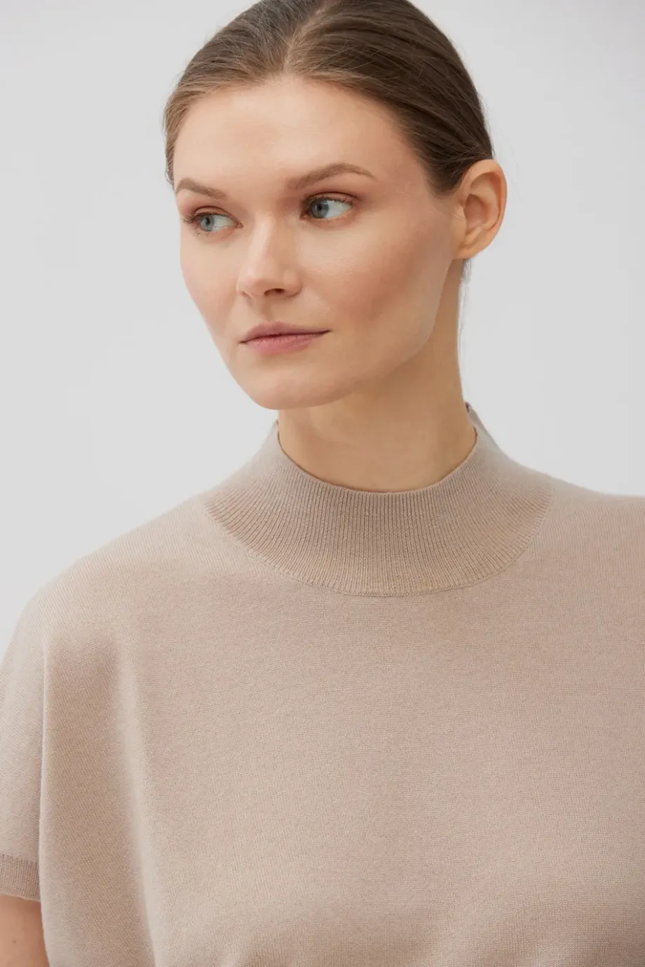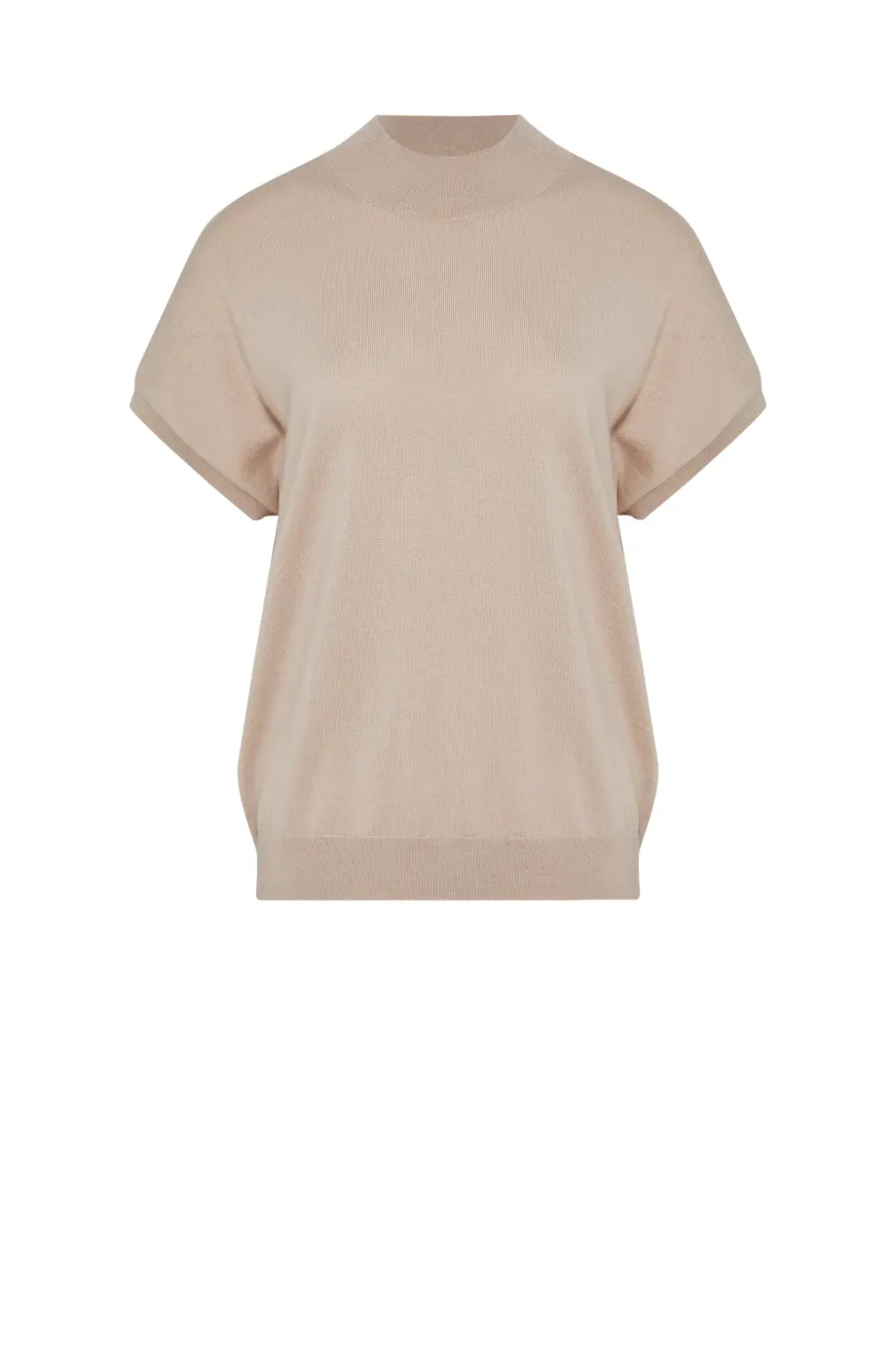 Bluse aus gekämmter Merinowolle, im Single-Jersey-Gewebe, Maschendichte 14 GG. Kurze Ärmel, Rundhalsausschnitt, lockere Passform. Farbe kühles Beige. Zum Ergänzen des Sets Hose aus dem gleichen Stoff.