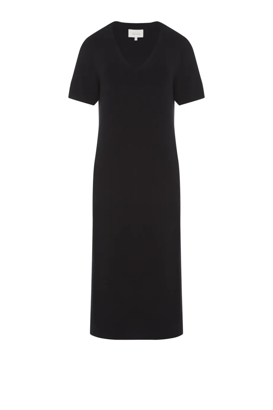 Schwarzes Midikleid aus Strick. Schlichte Passform mit V-Ausschnitt und Ellenbogenärmeln. Hergestellt aus hochwertigem, fein gestricktem FULL NEEDLE-Stoff auf einer Maschine mit Maschendichte 12 GG.